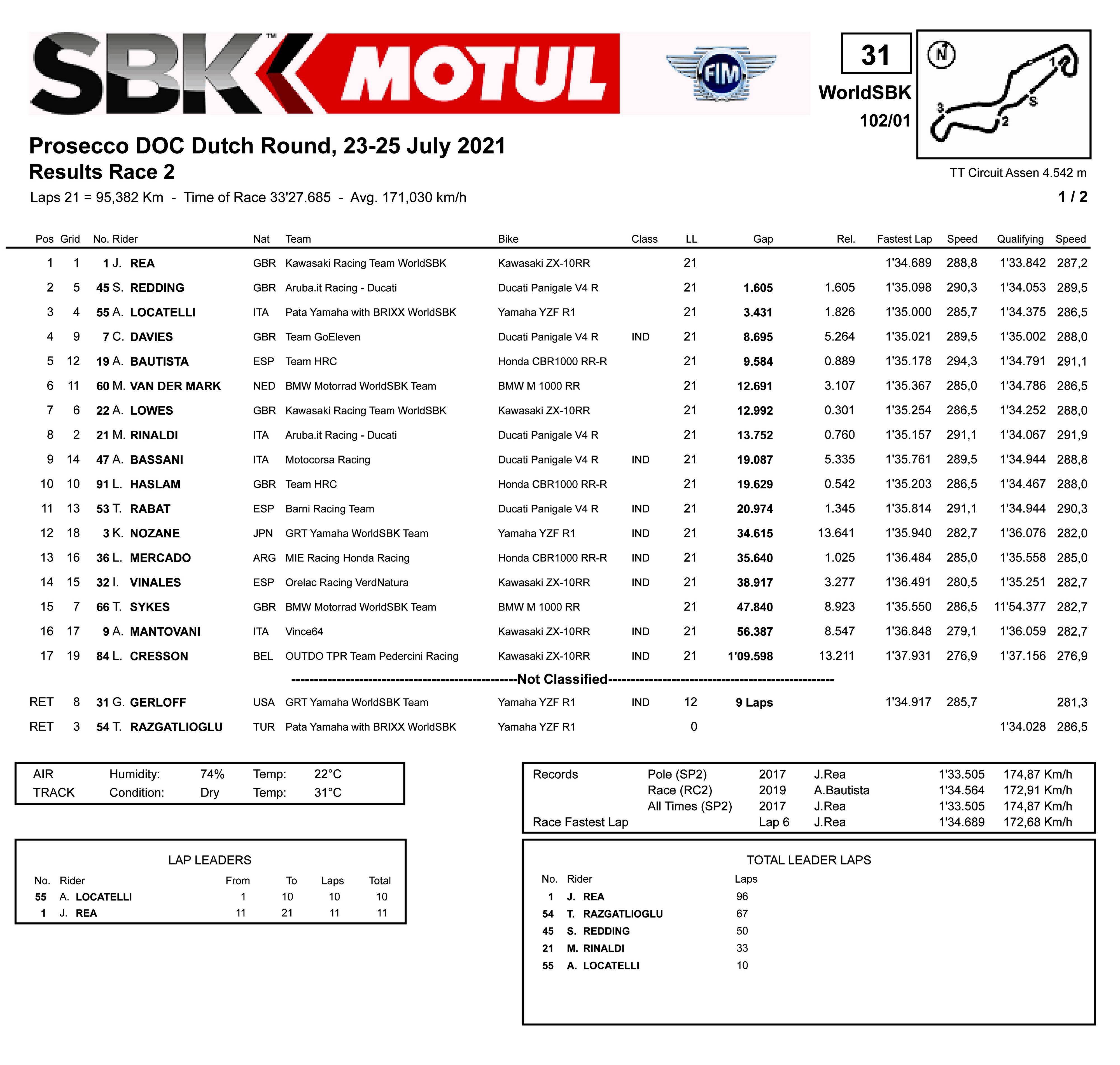 最終,雷亞奪得了第二節(jié)比賽的冠軍,在荷蘭這條跑道上、拿到了第 15 次的勝利。雷丁在第 19 圈超越了洛卡泰利,并順利帶返終點、獲得了亞軍。洛卡泰利拿到了季軍,這是他在 WSB 級別的首次登上頒獎臺,同時也是自 2015 年的馬克(Michael van der Mark)以來,另一位以 WSSP600 冠軍、首次升級到 WSB 級別的新秀(第一年參加 WSB 級別)身份,拿到了三甲的一席之地,而地點同樣是在這條艾森賽道。