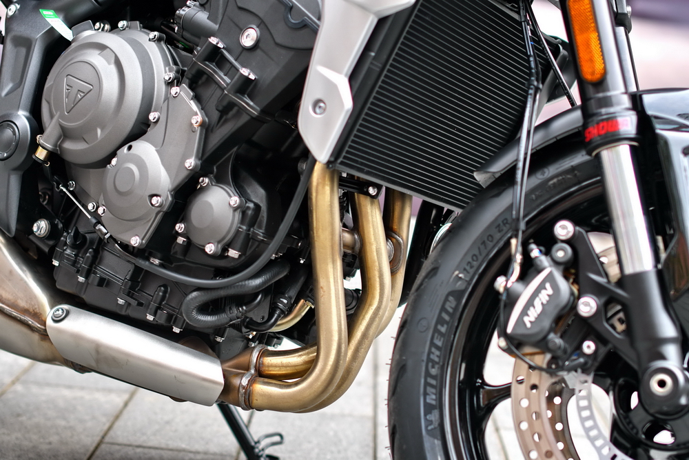 Trident 660 “ 三叉戟 ” 搭載一副凱旋全新開(kāi)發(fā)的、標(biāo)志性的水冷四沖程直列三氣缸、DOHC 每氣缸四氣閥的發(fā)動(dòng)機(jī),缸徑、行程為 74 mm x 51.1 mm 也意味著這副機(jī)器有著較好的動(dòng)力響應(yīng)。排氣量 660 cc,最大動(dòng)力輸出 60 kw(約 80 匹)。