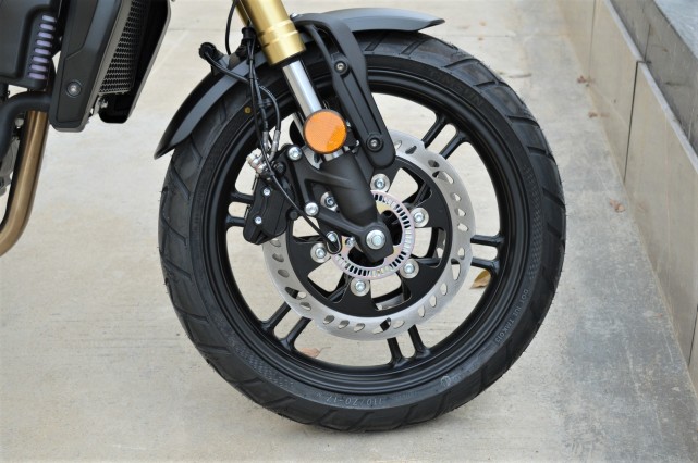 倒立式前叉的叉管換成了金色,檔次感瞬間拔高,300mm的前雙碟,搭配雙活塞剎車卡鉗,剎車力道很足。