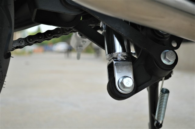 中置后避震采用多連桿的形式,帶有多段預(yù)載調(diào)節(jié)功能,需要注意的底盤部分最低的位置就是這里,所以跑爛路或者上下馬路牙子的時(shí)候需要注意一下。