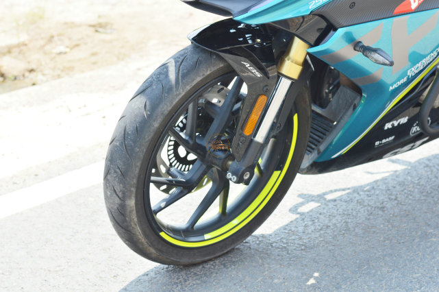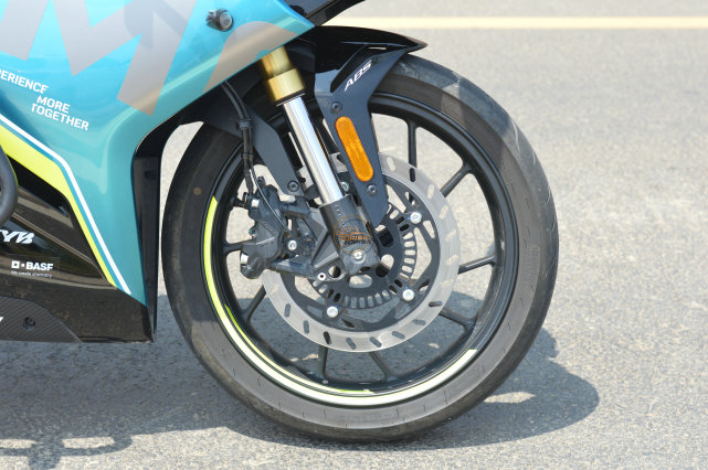 KYB的倒立式金色前叉,是賽道版的專屬配置,雖然不具備調(diào)節(jié)功能,但是也要比普通版的減震支撐性更強。