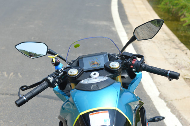 第一視角下的車頭部分非常干凈,全彩TFT儀表、黑色的上聯(lián)板占據(jù)中央位置,可折疊的后視鏡、分離式的手把營造出典型的跑車設(shè)定。