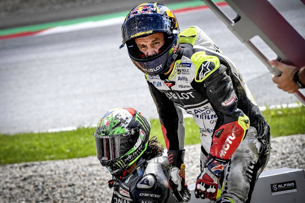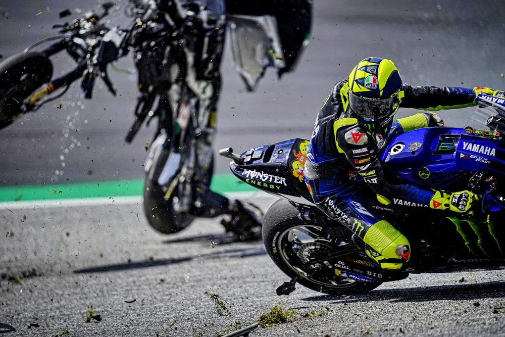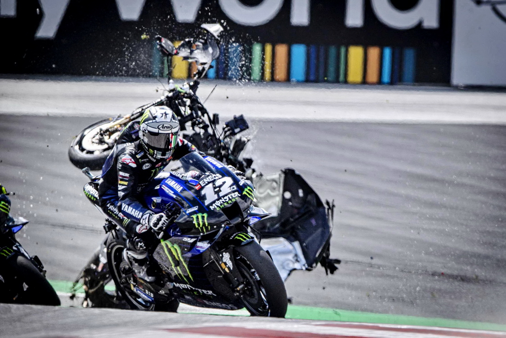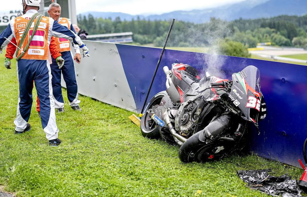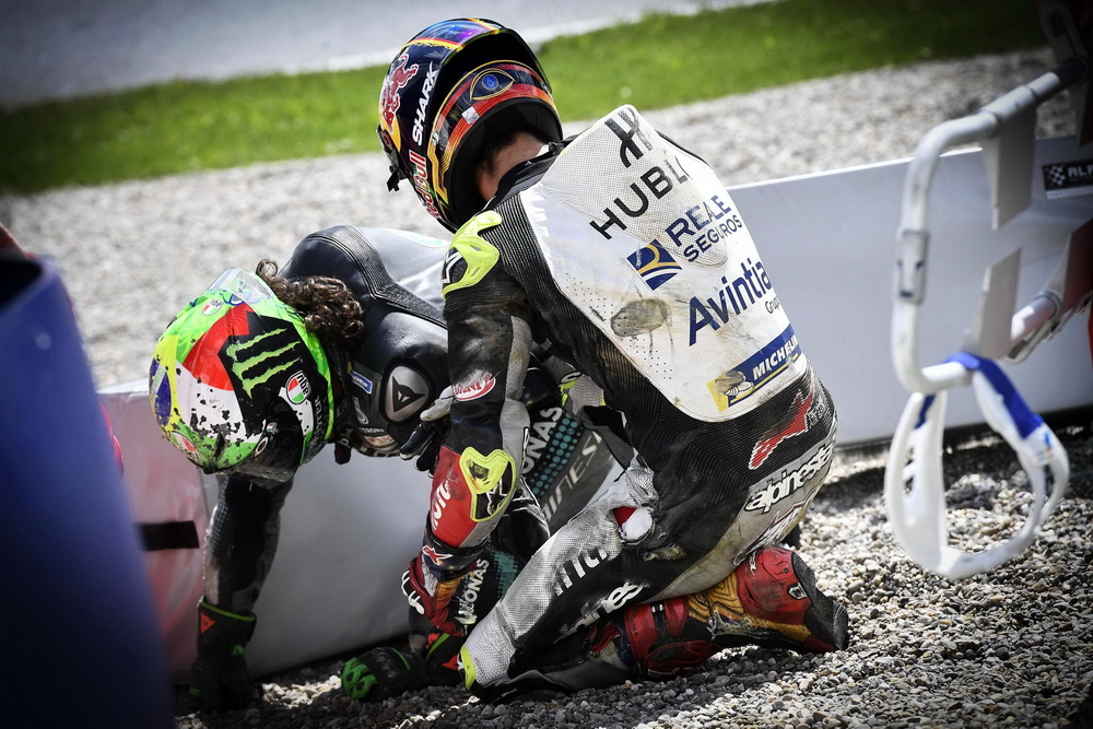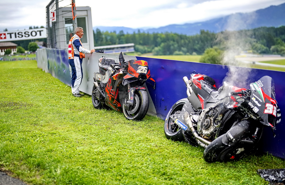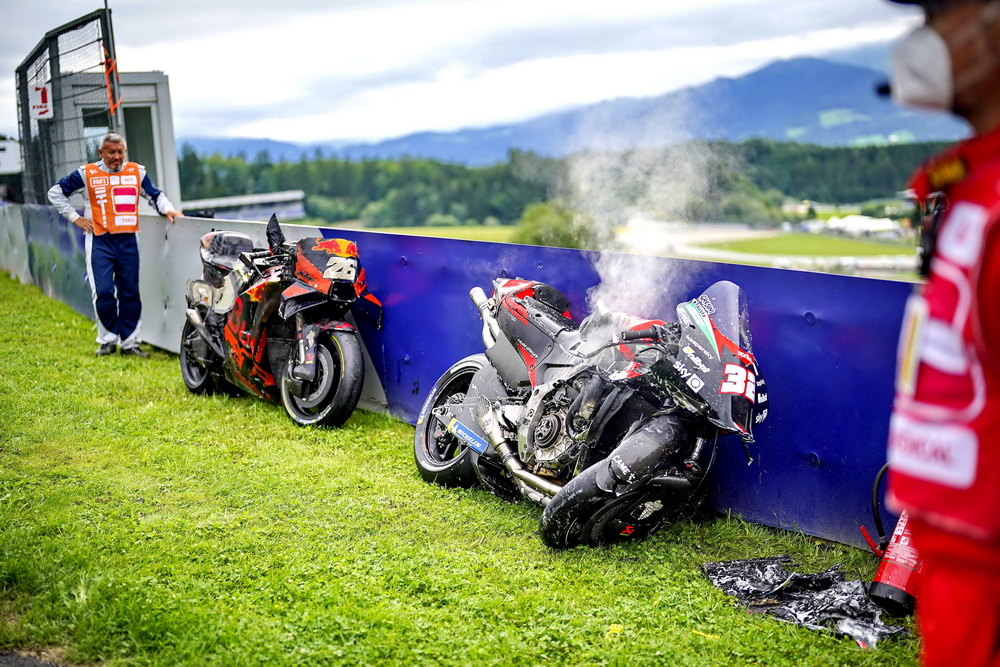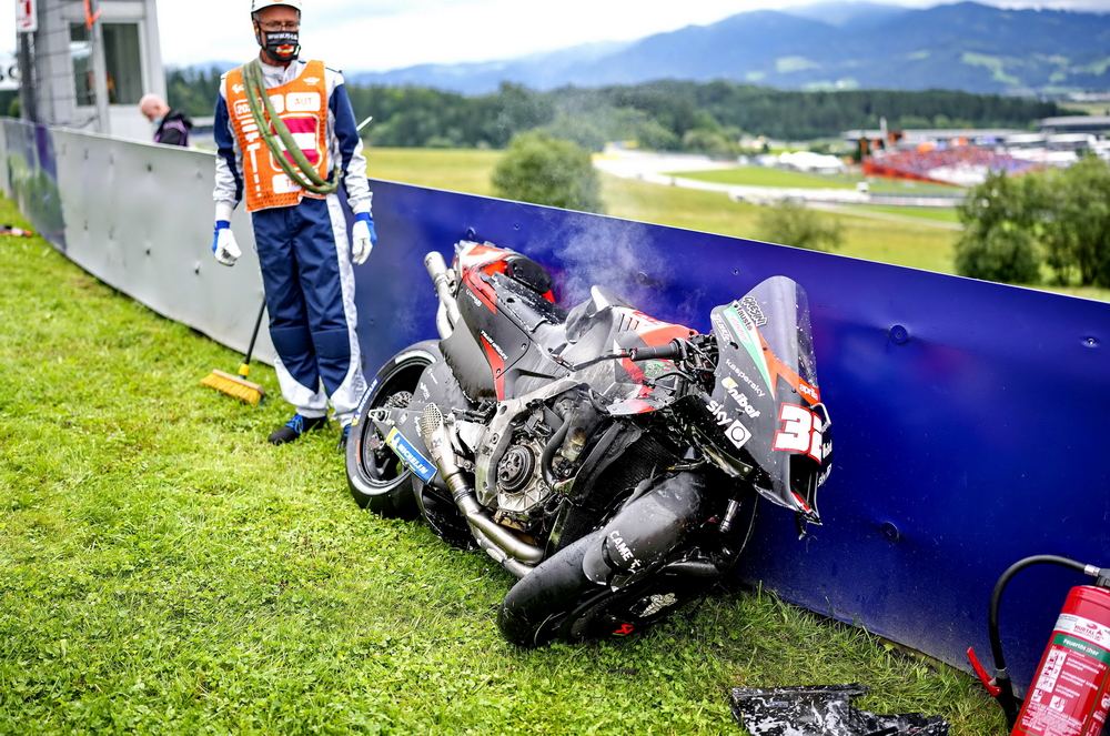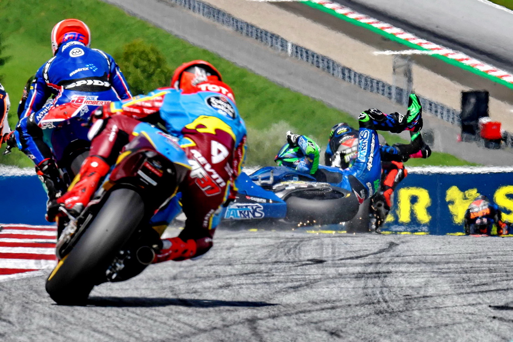連續(xù)兩年,奧地利的斯皮博格賽車場在 MotoGP 級別的比賽里都發(fā)生了紅旗終止比賽級別的、導(dǎo)致賽車解體的意外,在 2020 賽季第五站(奧地利的第一周比賽)的這一摔,更是被 MotoGP 官方列入了 Top 10 “ 十大經(jīng)典 ” 之一。而那一站的比賽,除了 MotoGP 級別之外,Moto2 級別也同樣地發(fā)生了導(dǎo)致比賽被紅旗終止的的意外。