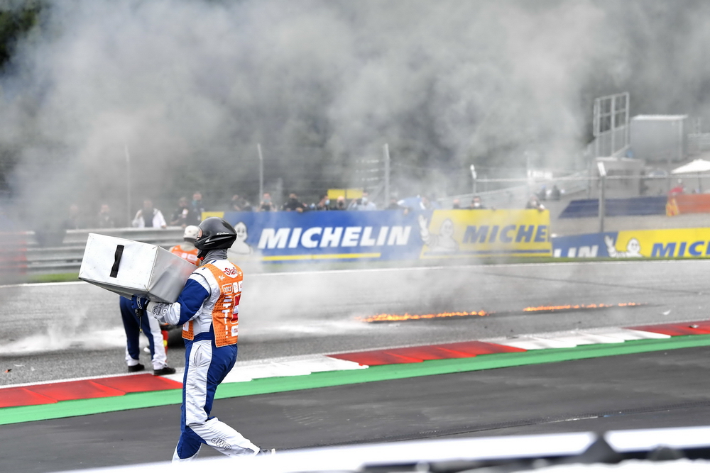 MotoGP 級別的比賽,第三圈的 T3,本站以外卡參賽的 26 號車、西班牙車手彼杜沙(Dani Pedrosa)因?yàn)槭チ饲拜喌目刂贫谲嚾褐兴さ埂6潭痰膸酌腌娭畠?nèi),隨后呼嘯而過的多臺賽車,都避開了還停留在賽道上的彼杜沙和他的賽車,但最終 32 號車的薩瓦多利(Lorenzo Savadori)在避過了車手之后、撞上地面的 RC16 賽車。碰撞發(fā)生之后,兩臺賽車起火。賽事隨即被紅旗所終止。