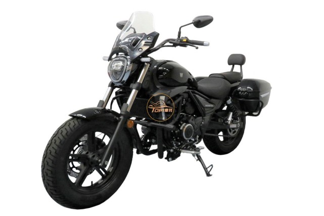 豪爵的這款250太子車型申報了兩個版本,帶風擋和邊箱、靠背的這個應該是摩旅版,下面可能是公路版,但是外觀上除此之外兩車再無差別。值得一提的是,這臺車原廠配備了護杠。