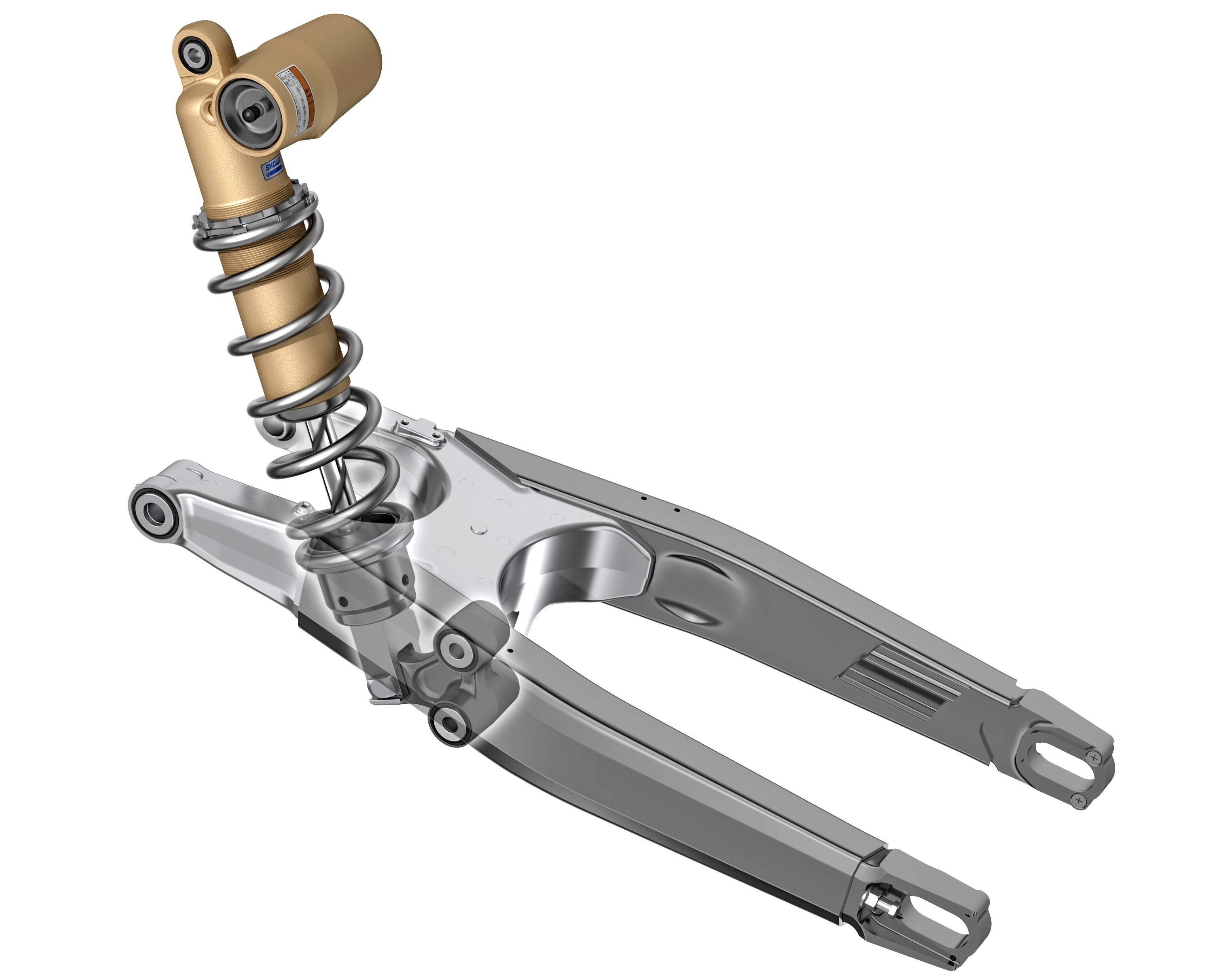 全可調(diào)的后減震同樣是來(lái)自 Showa 的配套,這個(gè)新的后減震采用了更大的主活塞閥組,以實(shí)現(xiàn)更快的響應(yīng)、更平滑的碰撞吸收。輕質(zhì)鋼制成的彈簧,也比上一版本輕了 120 克。壓縮/回彈阻尼經(jīng)過(guò)了優(yōu)化。