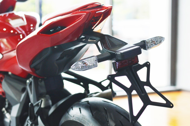 風琴式的三出排氣是MV Agusta標志性的設計,同時也能很好的把后輪轂的美感露出;倍耐力 提供Sports Demon Corsa輪胎。