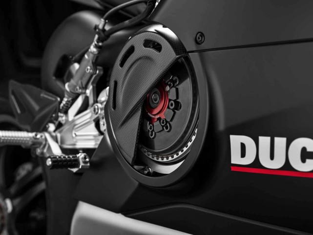 動(dòng)力方面,1,103cc排量的Desmosedici Stradale V型四缸發(fā)動(dòng)機(jī),最大功率157.2kw(214匹)/13,000rpm,最大扭矩122Nm/9,500rpm,與國外版本保持一致。此外SP版本配備了STM EVO-SBK干式離合器,這是來自杜卡迪賽道上的技術(shù),一個(gè)開放的碳纖維離合器蓋極具視覺沖擊力。
