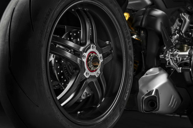 從外觀上看其實(shí)Panigale V4 SP很好辨認(rèn),油箱采用外露鋁制,整流罩為啞光黑色,除了在側(cè)包圍上和坐墊上有V4 SP的字樣之外,還大量采用碳纖維材質(zhì),包括:碳纖維輪輞、碳纖維定風(fēng)翼,碳纖維前擋泥板等等。