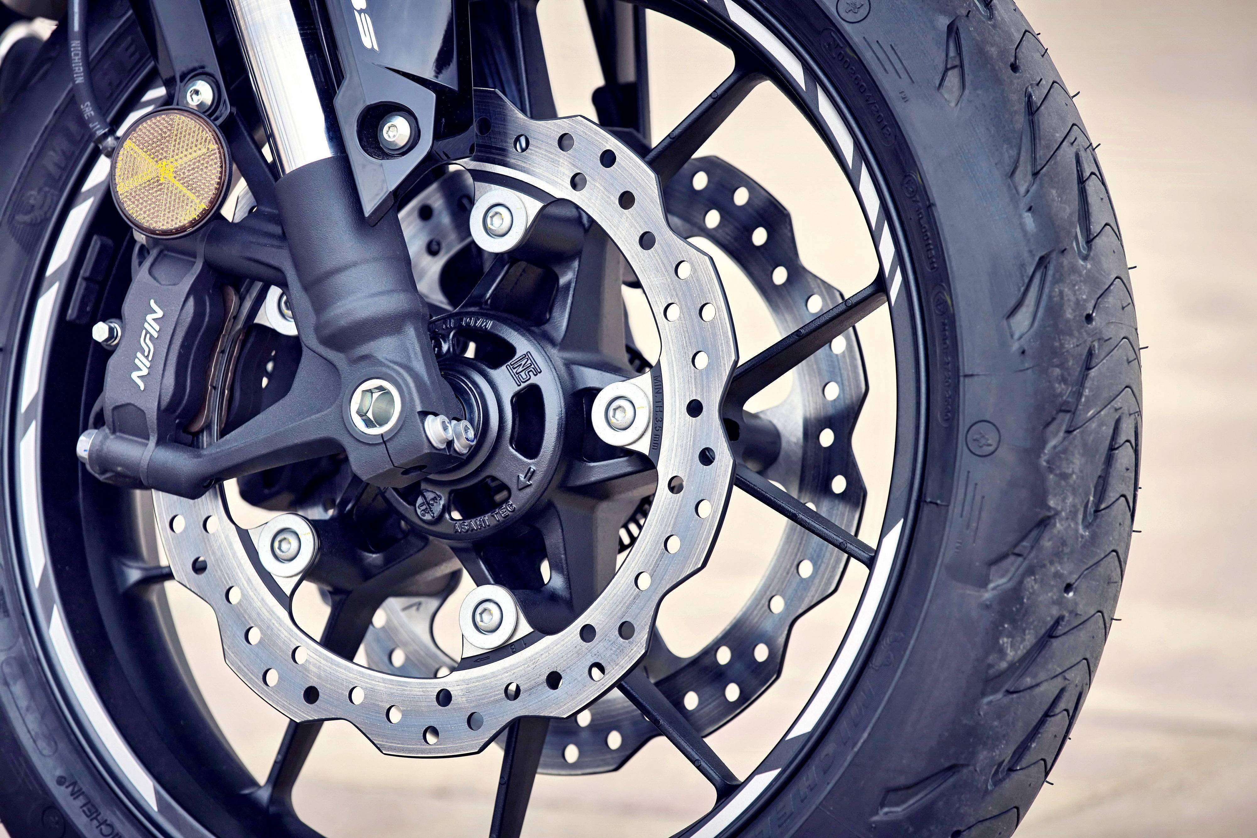 前懸掛系統(tǒng),從現(xiàn)行 2021 款的 41 mm 正立式前叉、換裝為現(xiàn)在的倒立式前叉;前制動系統(tǒng),從單碟剎車升級至現(xiàn)在的雙碟、輻射式安裝的前卡鉗;重量分布也比 2021 款略微前移,以增強前輪胎抓地力和手感;LED 的前大燈也經(jīng)過了改進。