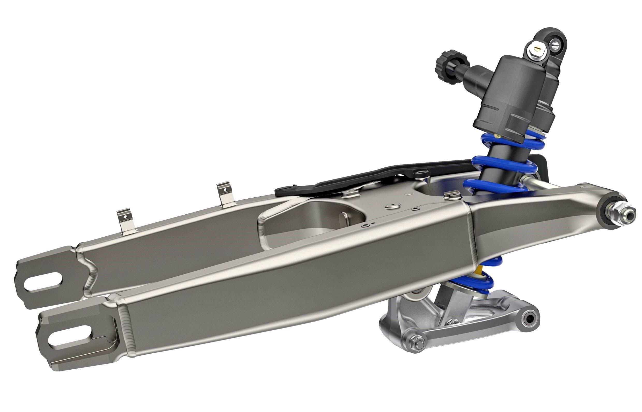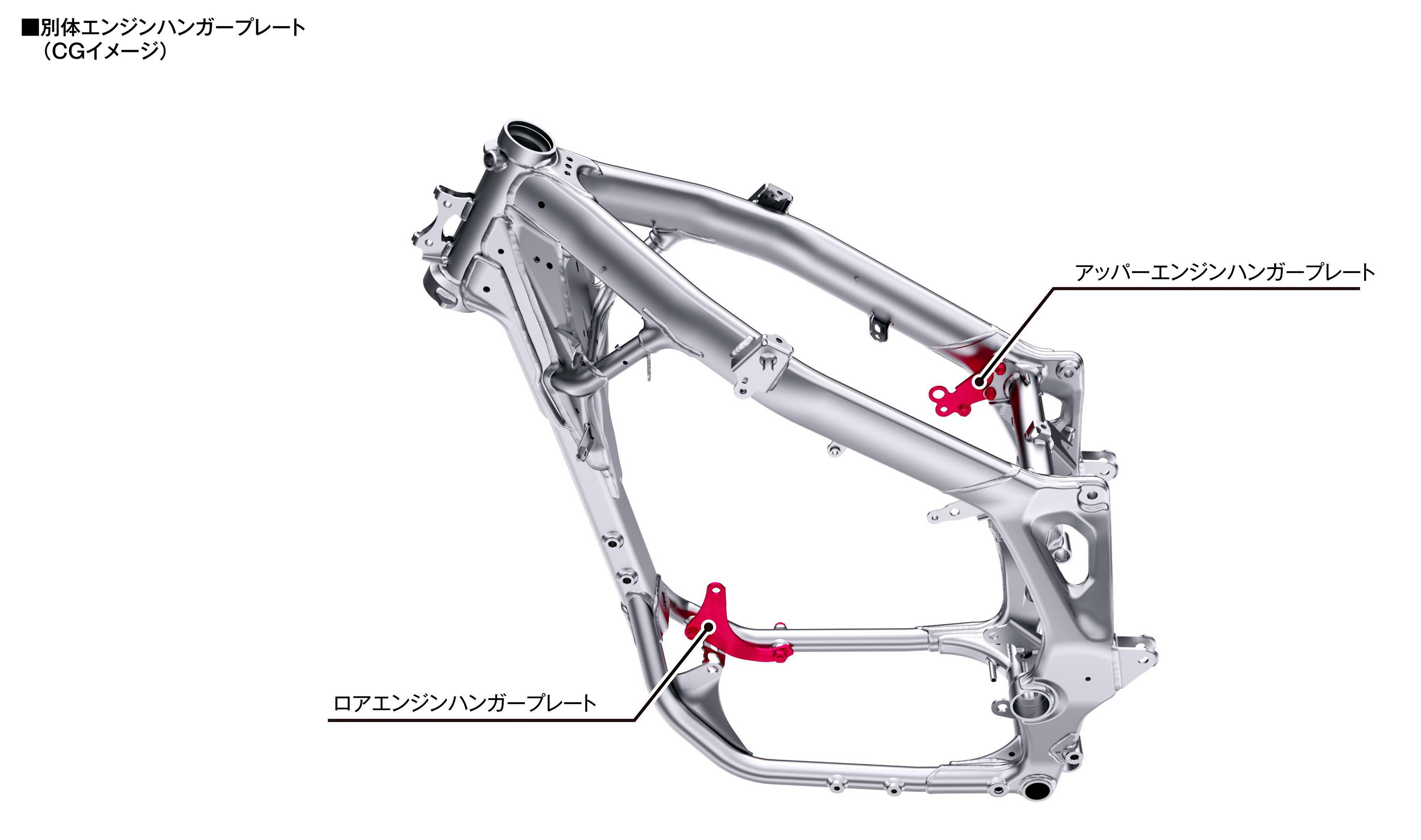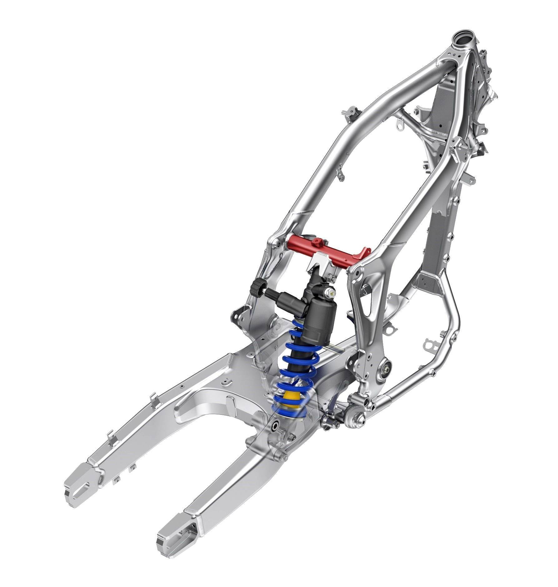 在特點(diǎn)上,車架轉(zhuǎn)向頭周圍的部分(前轉(zhuǎn)向主軸的固定位置)、其剛性在上一版本的基礎(chǔ)經(jīng)過了進(jìn)一步的優(yōu)化,以增強(qiáng)前端抓地力;主樑變得更細(xì)、更直,并去掉了前面的橫管,栓接式的鋁制尾樑、取代了上一版本所采用的整體鋼結(jié)構(gòu)。而鋁合金制的后搖臂,采用了與 CRF450R 賽車相似的設(shè)計(jì),該后搖臂的剛性經(jīng)過改進(jìn),可提高后輪的牽引力和騎士駕駛過程中的手感。