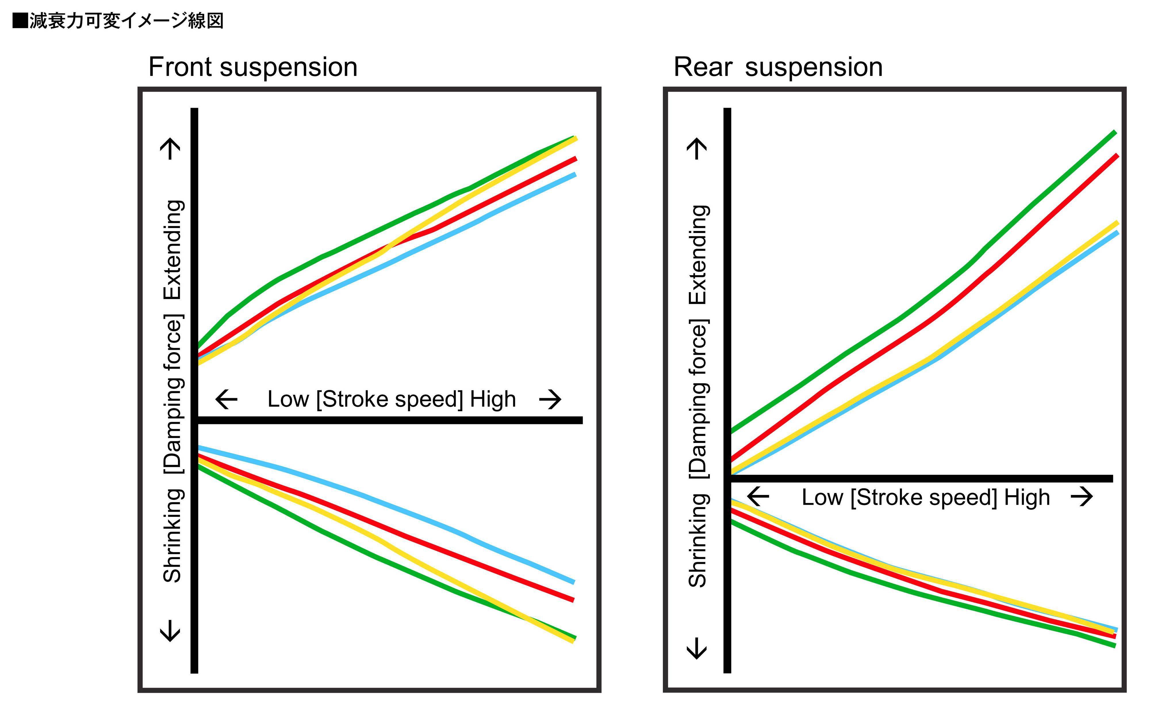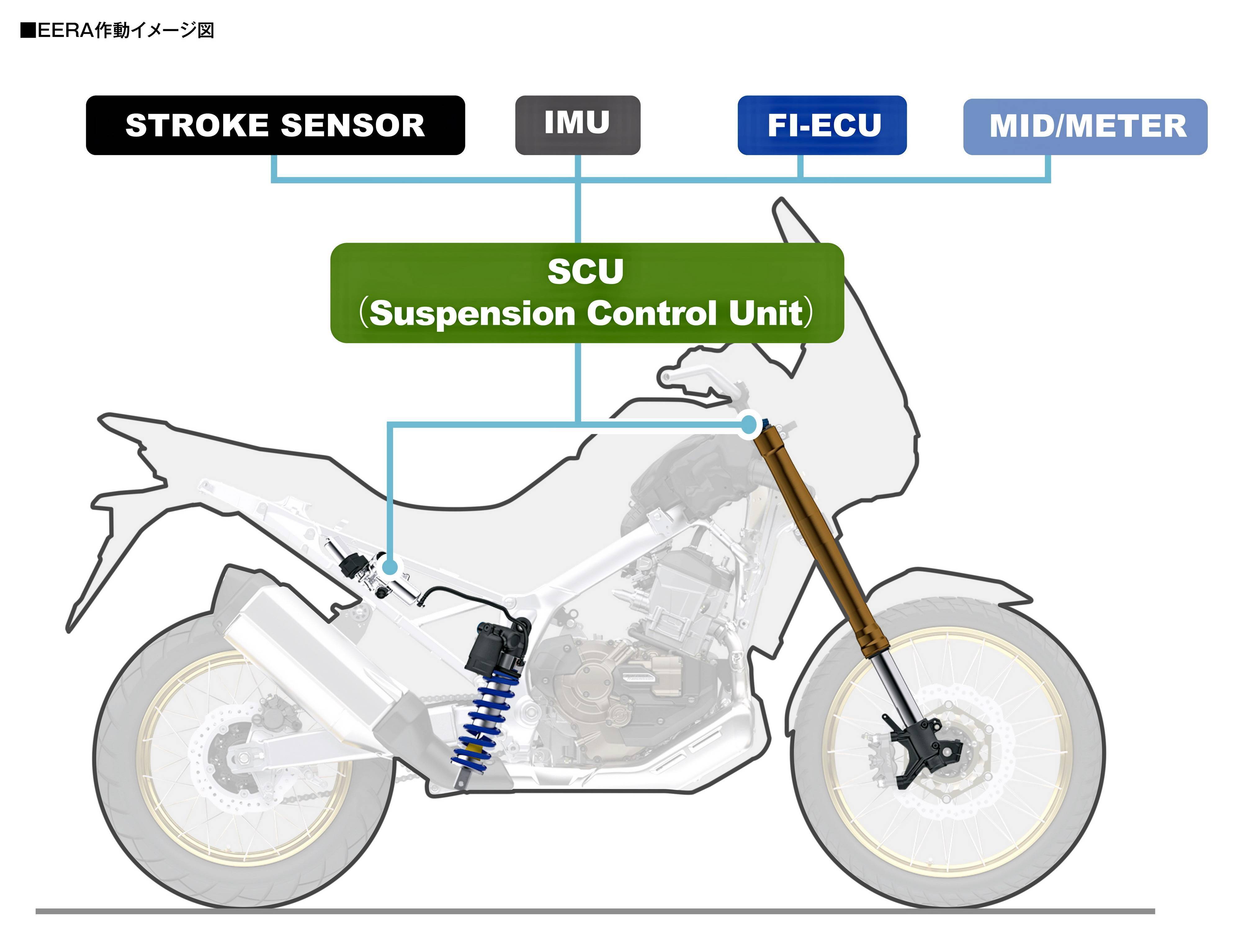 下面的圖片,CRF1100L Adventure Sports ES 版所標(biāo)配的 EERA 電控懸掛系統(tǒng)特性和動(dòng)作原理示意圖(資料圖片)。