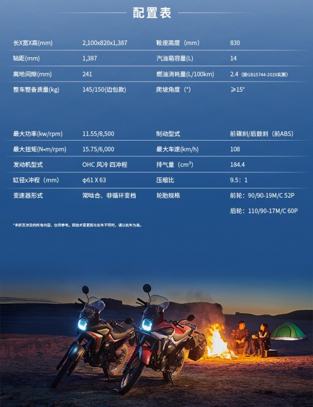 本田CRF190L主打的是通過性,最小離地間隙高達241mm,配備前19后17的鋼絲輻條輪,其實它這個外觀更接近越野車型,不過本田稱之為入門級ADV拉力車。