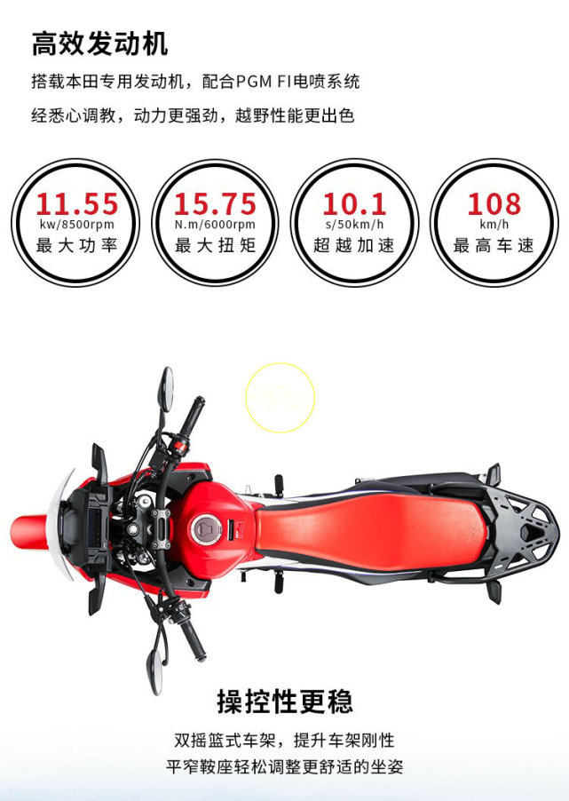 最大功率11.55kw/8500rpm,最大扭矩15.75N/6000rpm,動力數(shù)據(jù)要比CBF190X(12.4kw/16.3Nm)小,相比之下CRF190L的功率峰值轉(zhuǎn)速更高,但是扭矩峰值轉(zhuǎn)速更低。