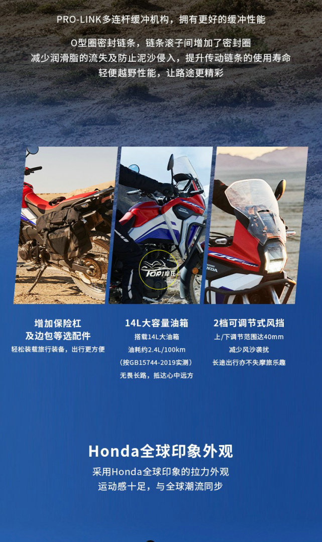 前減震行程有180mm,后減震采用多連桿的形式,14L的油箱容量只比CBF190X大了兩升而已,官方公布的油耗為2.4L/100km,理論續(xù)航超過550公里。原廠配備2檔可調(diào)節(jié)的風擋,調(diào)節(jié)行程40mm,能夠起到一定的保護作用,而護杠和邊包都需要選裝才有。