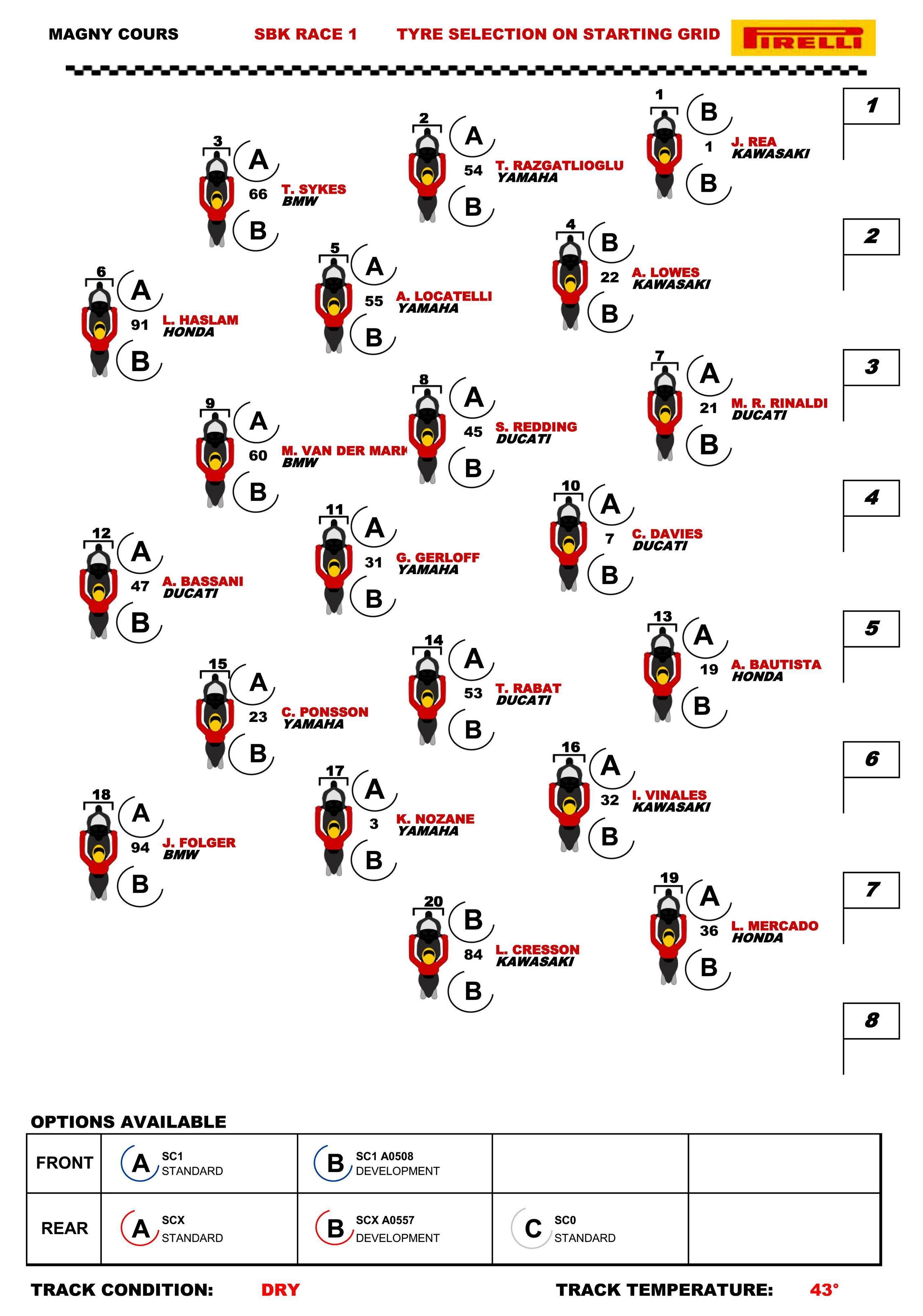 WSBK 的比賽統(tǒng)一使用 Pirelli 倍耐力的輪胎,本站的比賽,倍耐力在干地、中等路面、濕地路面三個(gè)不同狀態(tài)下,為 WSB 級(jí)別的車(chē)手,提供五個(gè)前胎、六個(gè)后胎的不同表面化合物軟硬度的選擇。