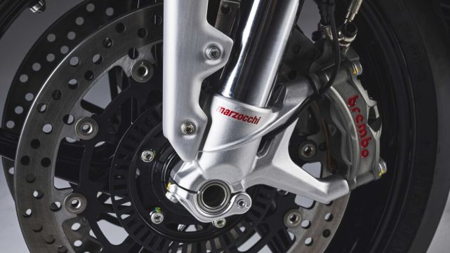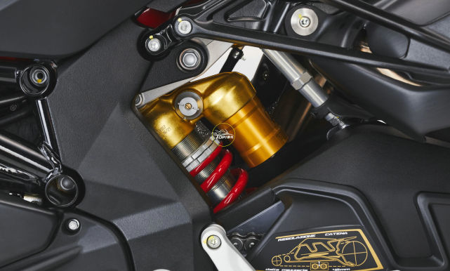 另外,在避震方面也有區(qū)別,電子控制的Ohlins NIX EC前叉和TTX后避震器消失不見(jiàn),取而代之的是手動(dòng)調(diào)節(jié)的Marzocchi倒立式前叉和Sachs后避震。不過(guò),依然配備了頂級(jí)規(guī)格的Brembo Stylema剎車(chē)卡鉗,全套的電子配置也得以保留下來(lái)。