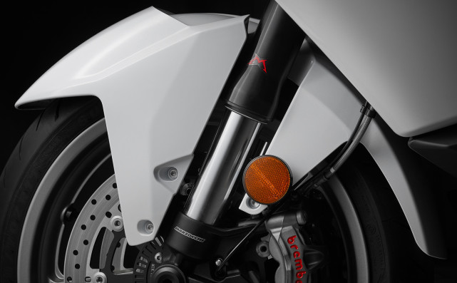 MARZOCCHI倒置前減震,全段可調(diào),行程130mm;中置后減震,全段可調(diào),行程128mm。Brembo剎車卡鉗,320mm浮動前雙碟盤設(shè)計,搭配Brembo對向4活塞輻射卡鉗;后剎采用270mm固定單碟盤與Brembo對向雙活塞卡鉗的組合,標(biāo)配彎道ABS系統(tǒng)。