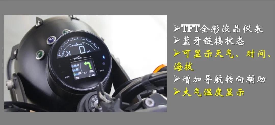 TFT液晶儀表,可藍(lán)牙連接,帶導(dǎo)航轉(zhuǎn)向輔助功能。