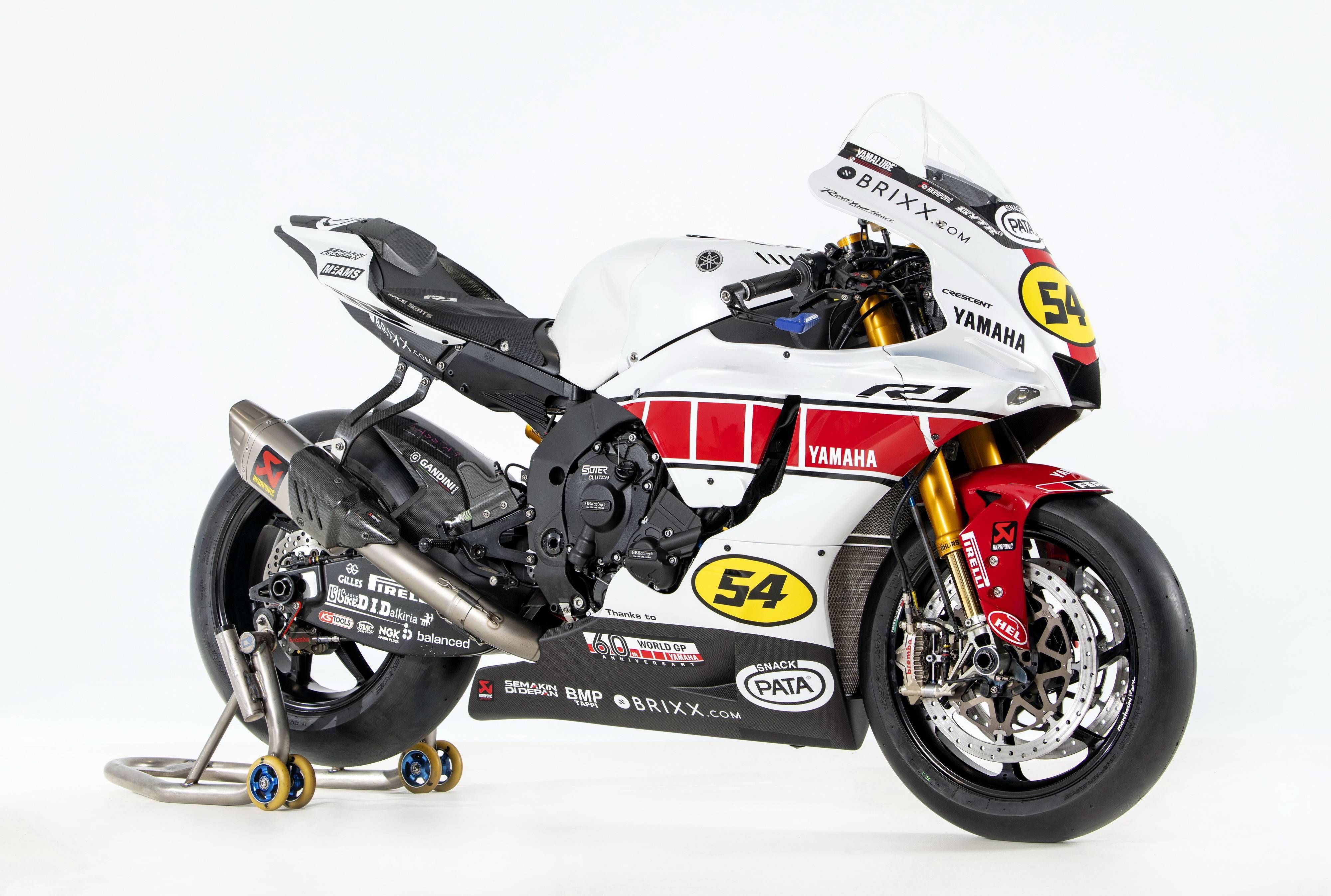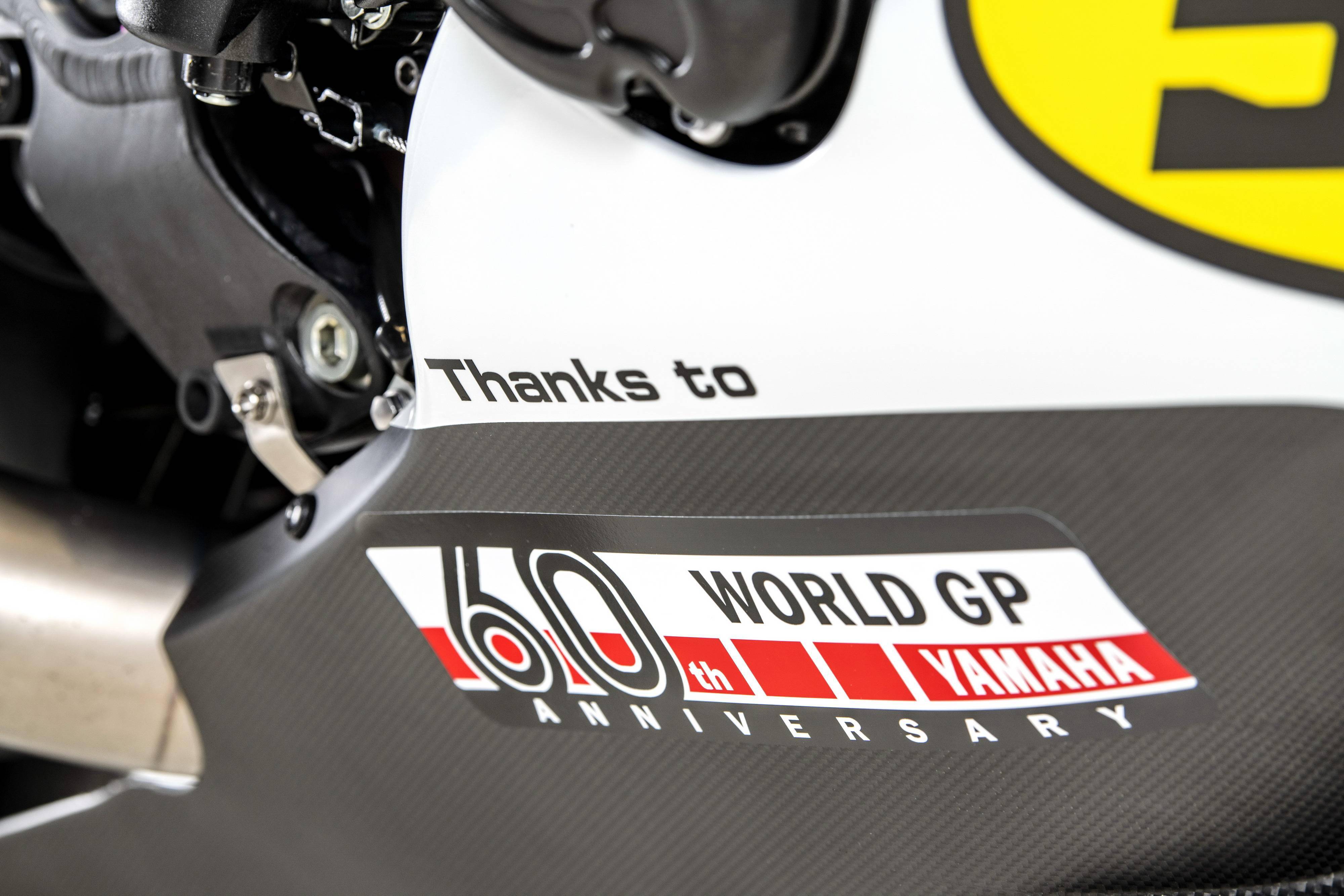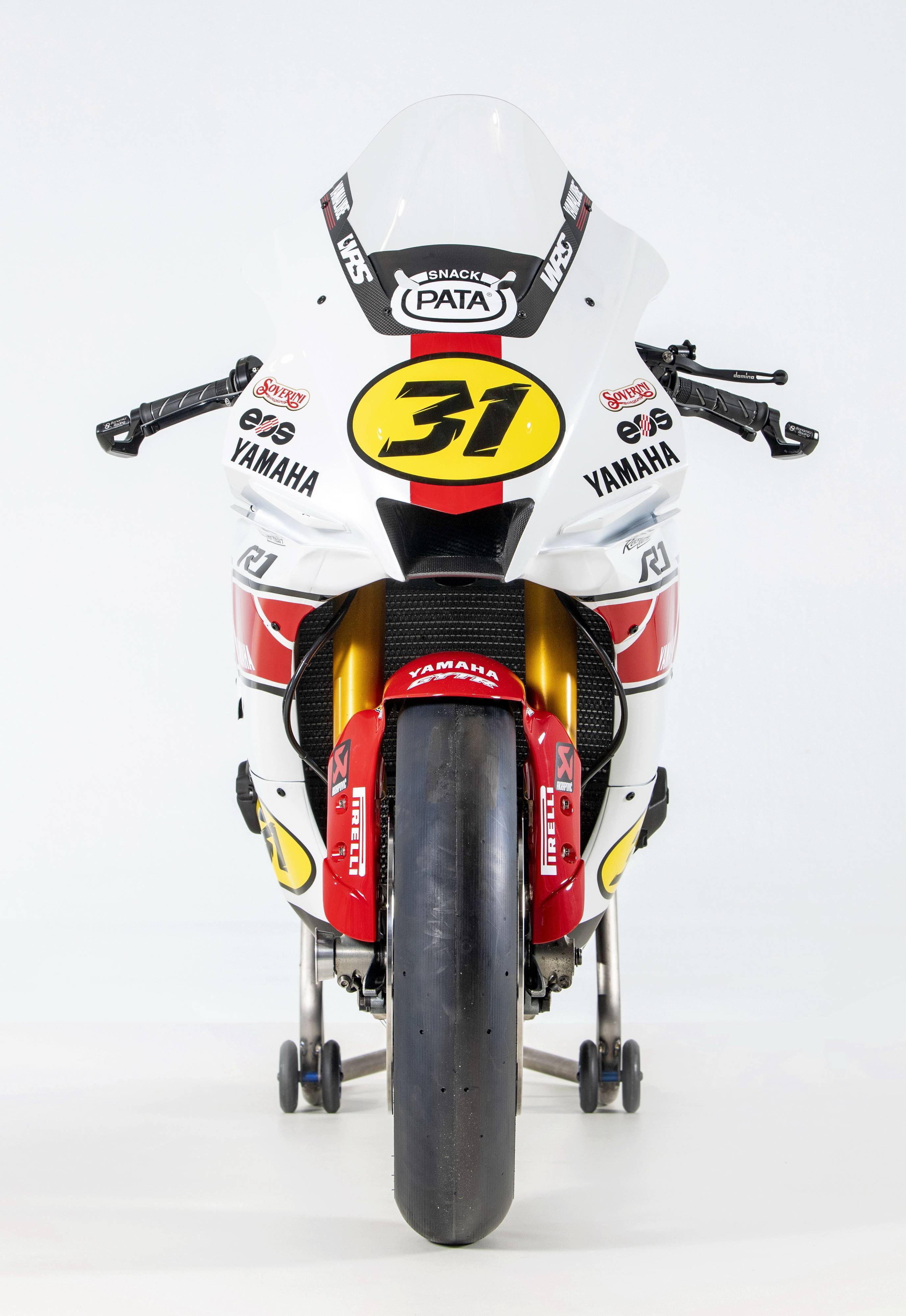 下圖:采用 GP 參賽六十周年紀(jì)念圖案、Pata Yamaha with Brixx 工廠車隊(duì)的 YZF-R1 賽車。