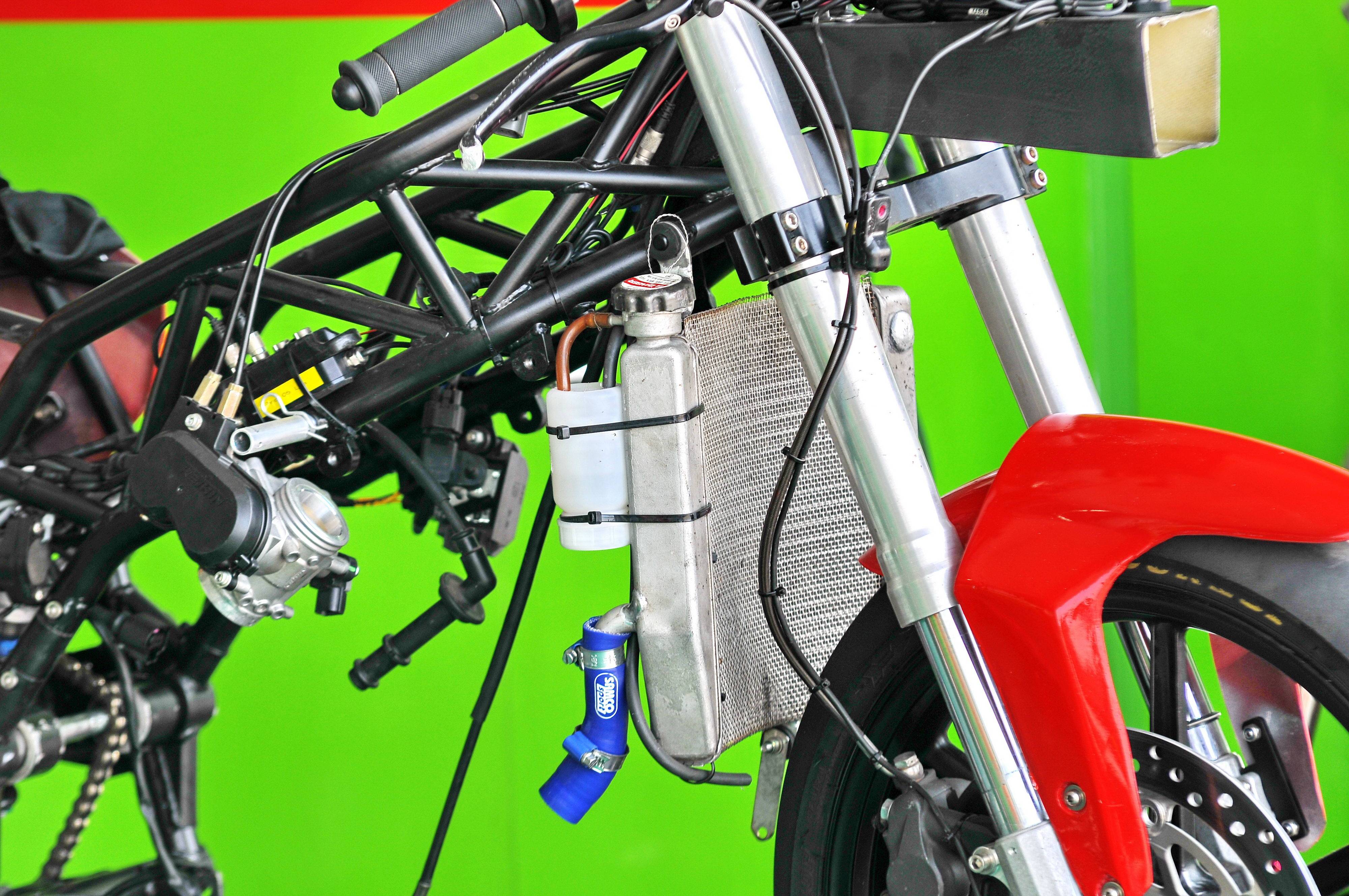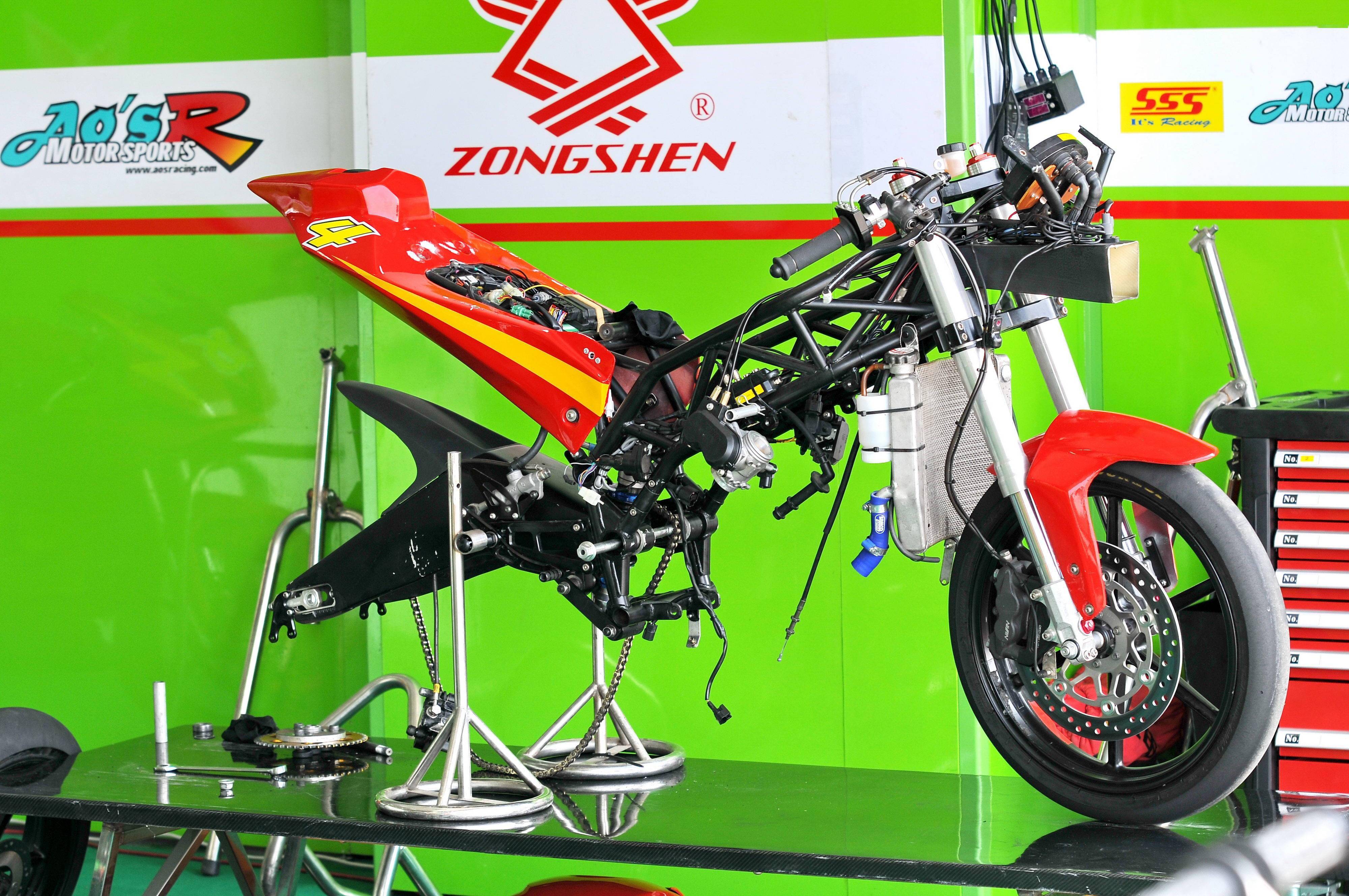 鋼管編織式的車架,單氣缸的發(fā)動(dòng)機(jī),電子燃油噴注,YZF-R6 風(fēng)格的車頭整流罩,是宗申這臺(tái)賽車的主要特征。