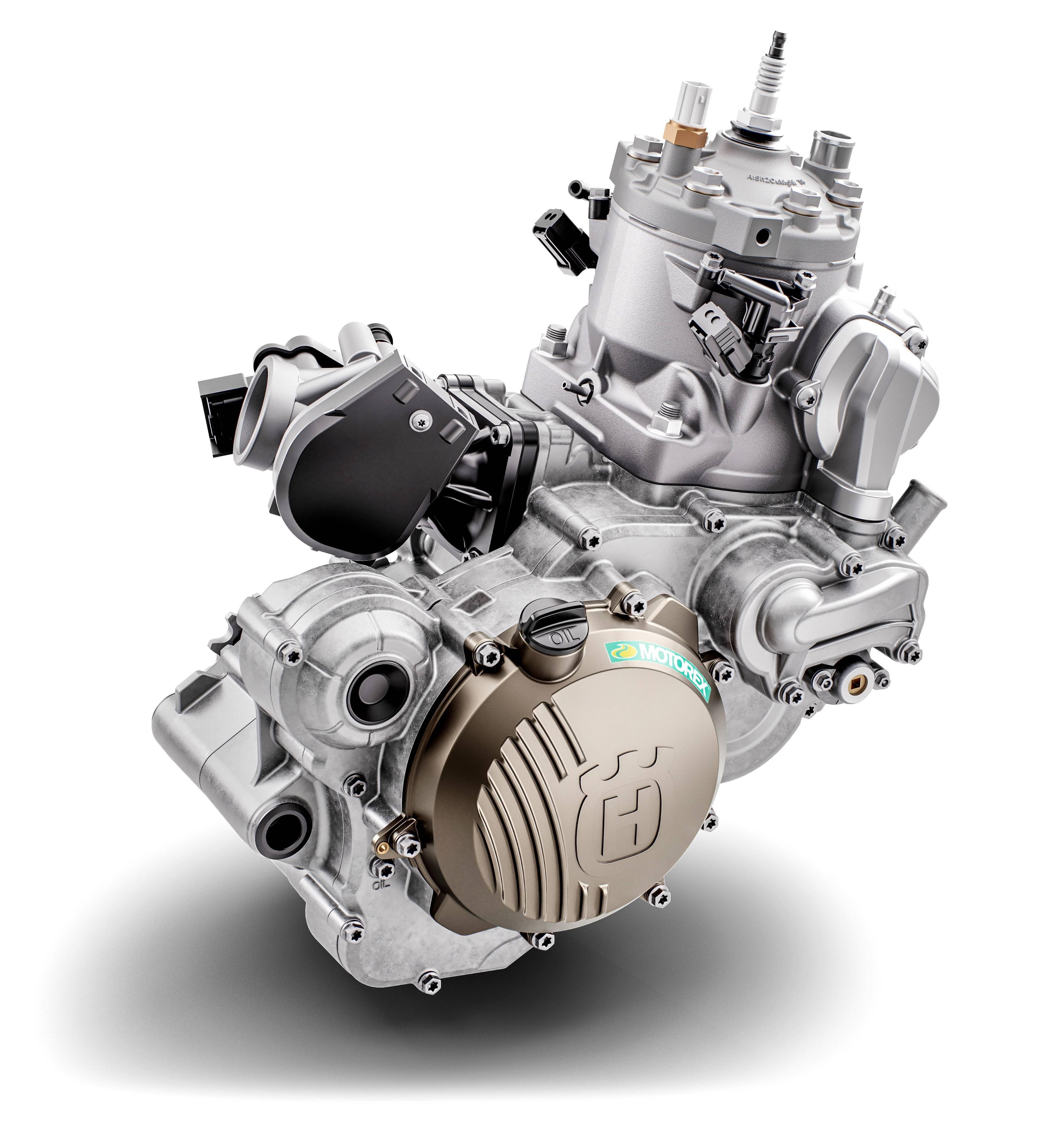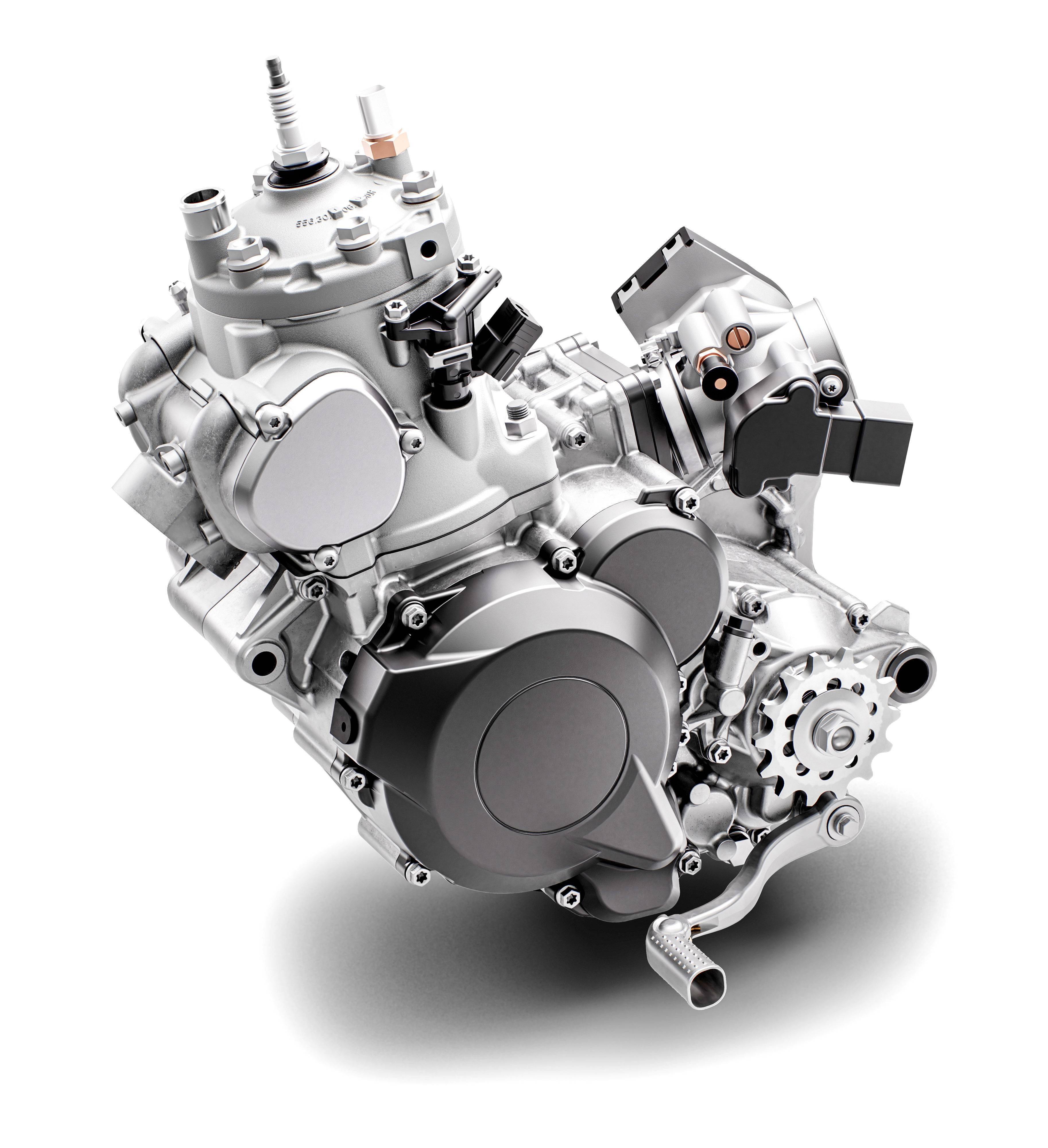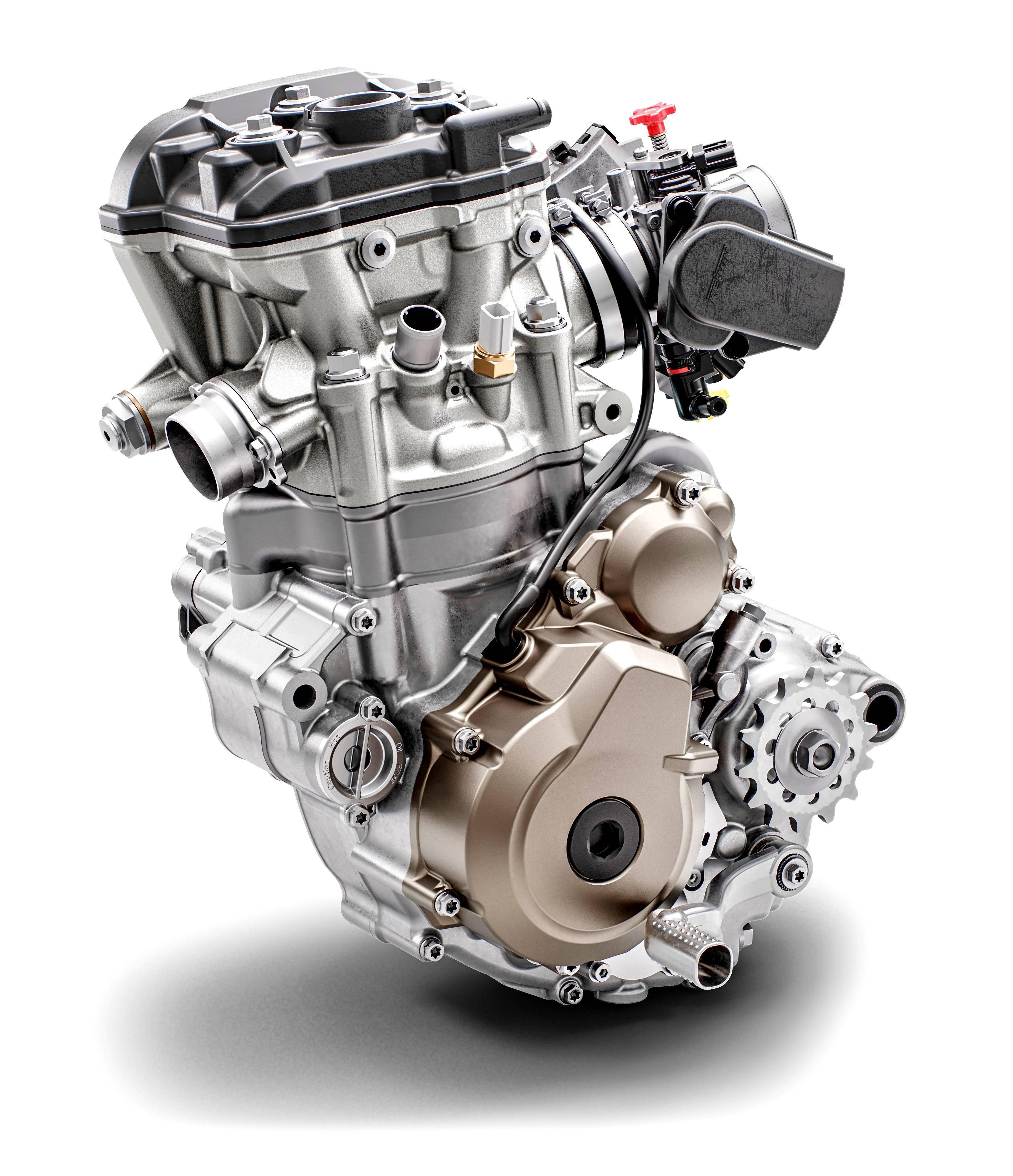 FE350 搭載一副四沖程單氣缸、DOHC 四氣閥的發(fā)動機,車把上裝有可改變電噴系統(tǒng)中 ECU 點火程序的按鈕,讓騎士可以根據(jù)不同的狀況、實現(xiàn)快速地調(diào)整發(fā)動機輸出特性,滿足越過各種極限地形的需要。