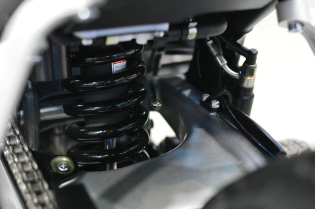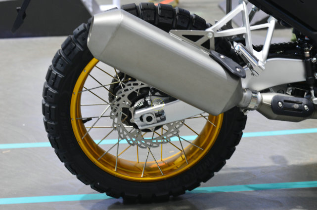鋁合金的后搖臂很顯然也是為了越野而設計,就是這根非常粗大、非常運動的排氣管有些出戲。后剎車的單碟盤并不是我們常見的實心盤,而是類似越野摩托車大幅度鏤空設計。
