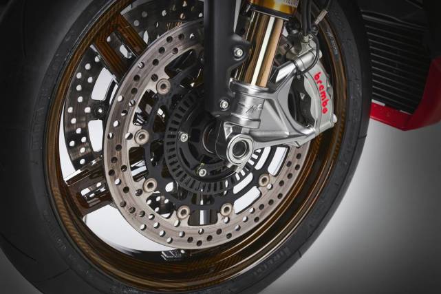 硬件方面,配備Ohlins Nix EC倒立式前叉和Ohlins EC TTX后避震器,均支持電子調(diào)節(jié)。前后電子懸架重新調(diào)校以提高騎行精度,還搭載了OHLINS的電子轉(zhuǎn)向阻尼器。制動方面,Brembo 最新的Stylema整體式徑向前制動卡鉗,搭配320mm的雙制動盤。