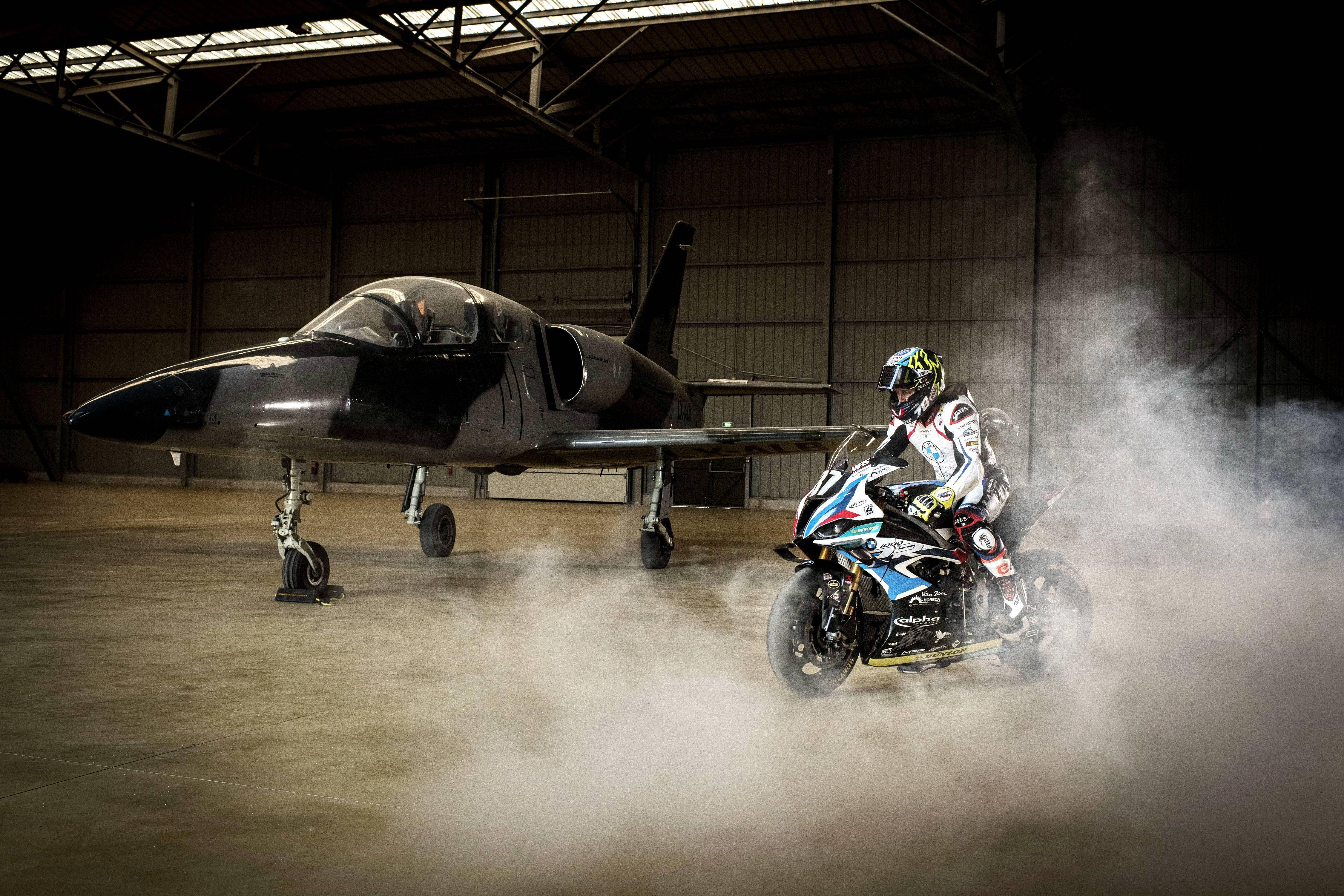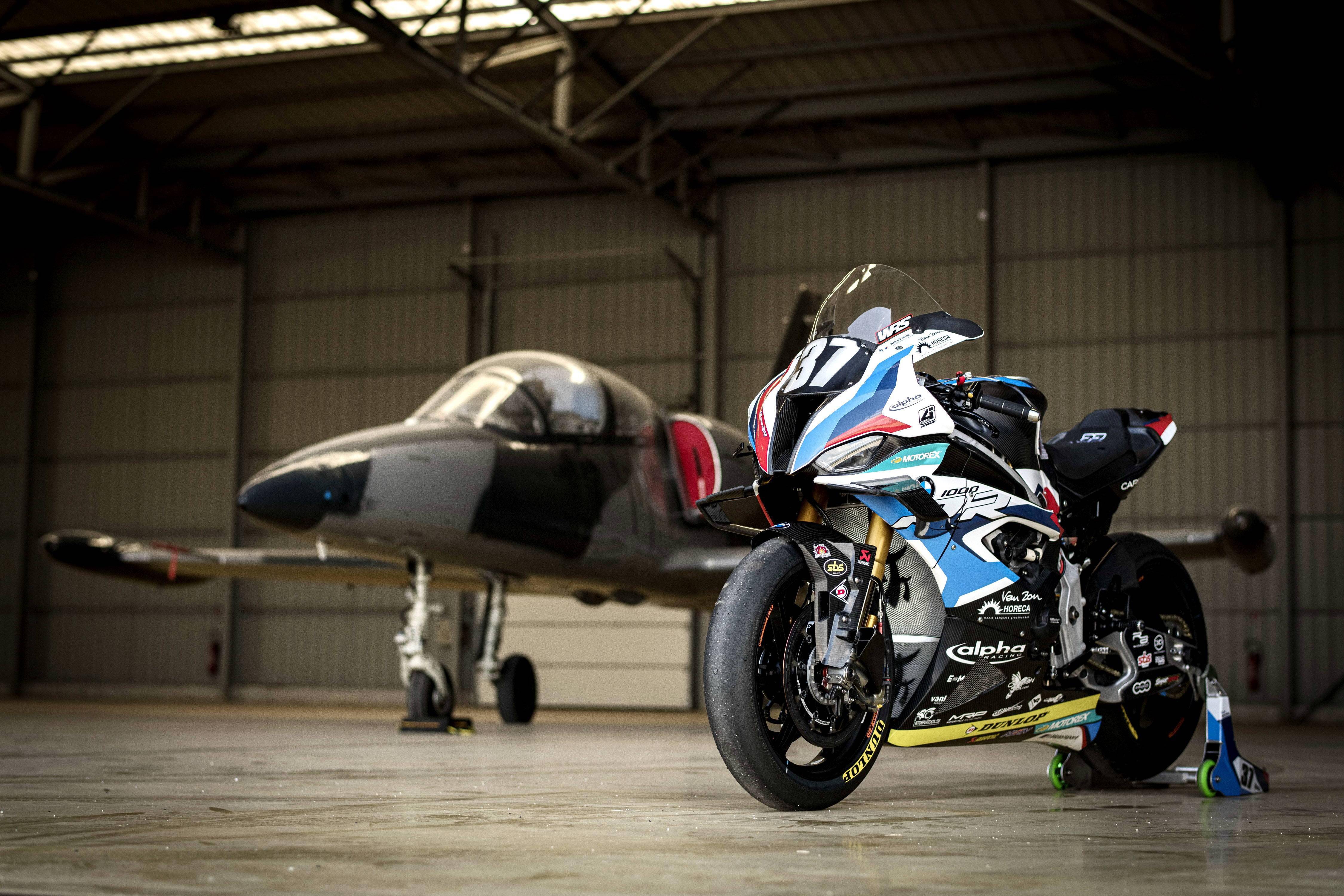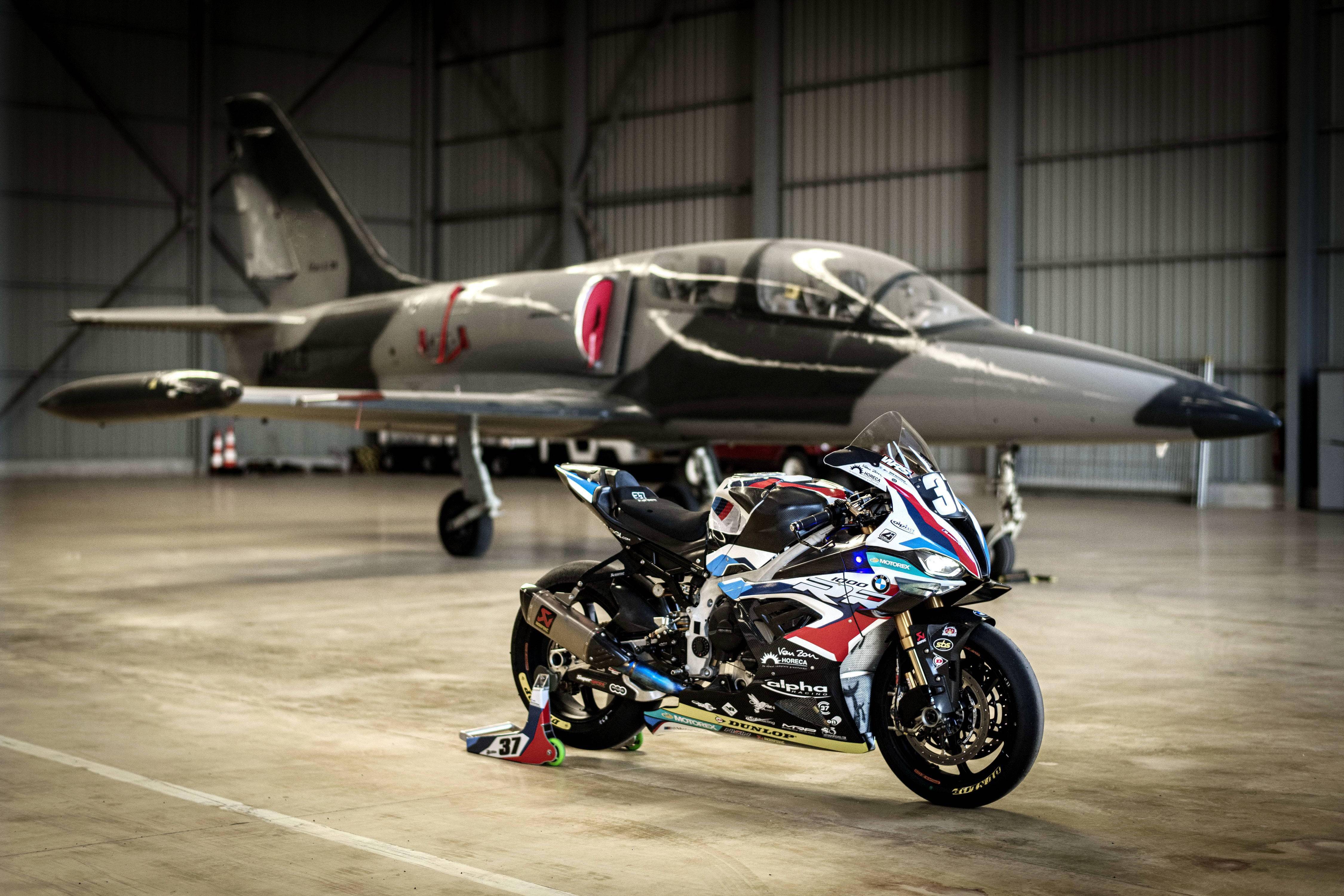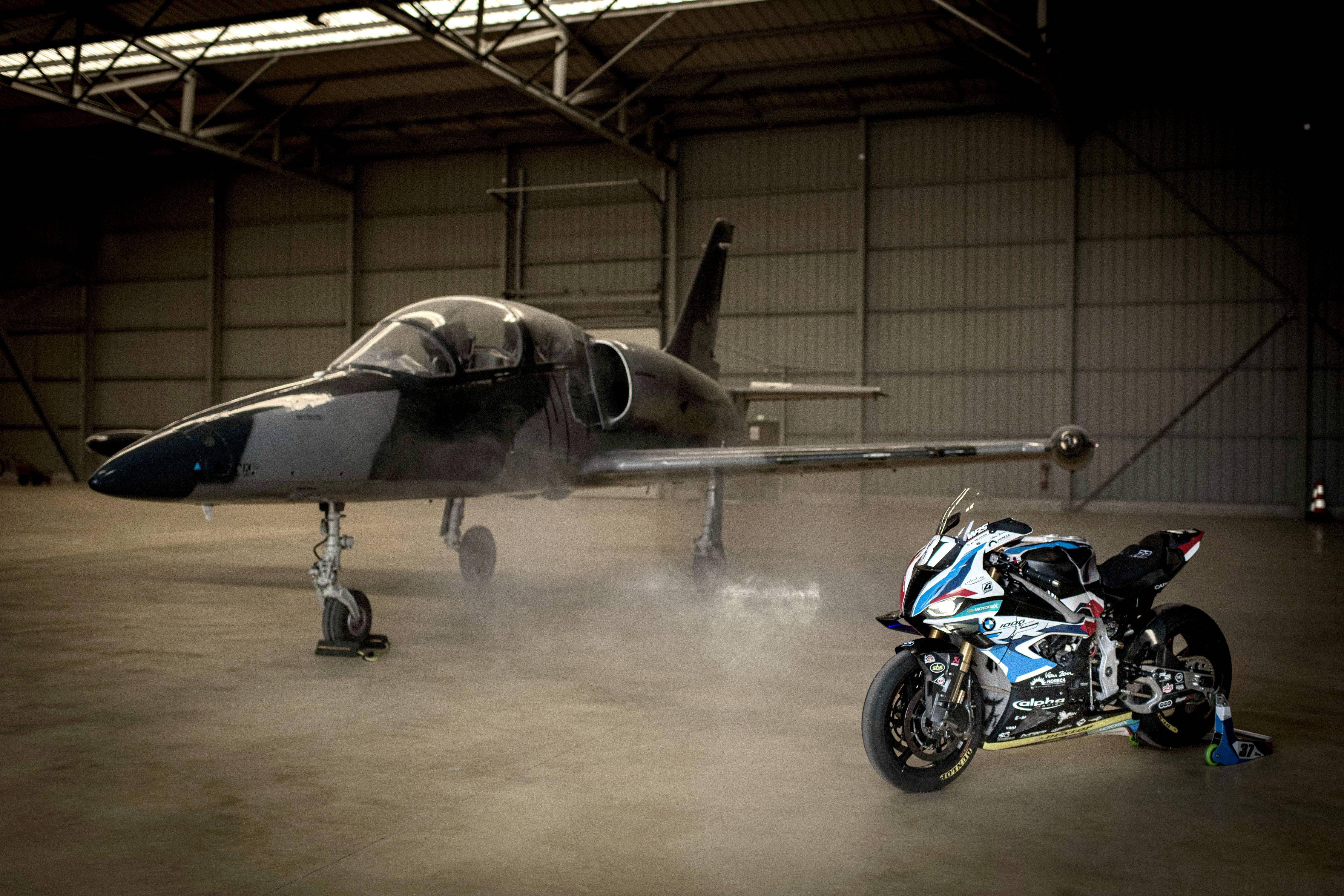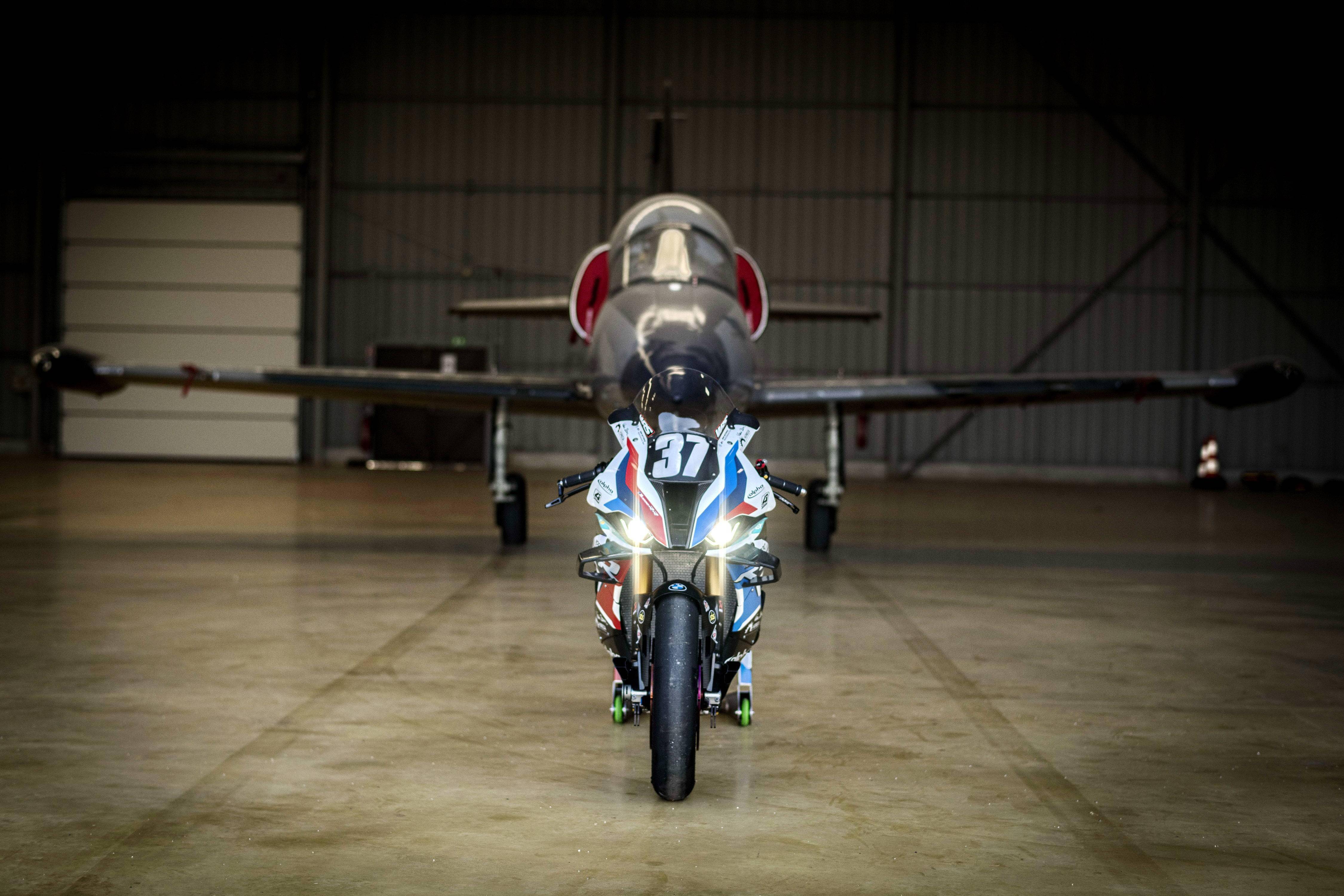 寶馬 M1000RR EWC 工廠賽車與噴氣式飛機(jī)的合照