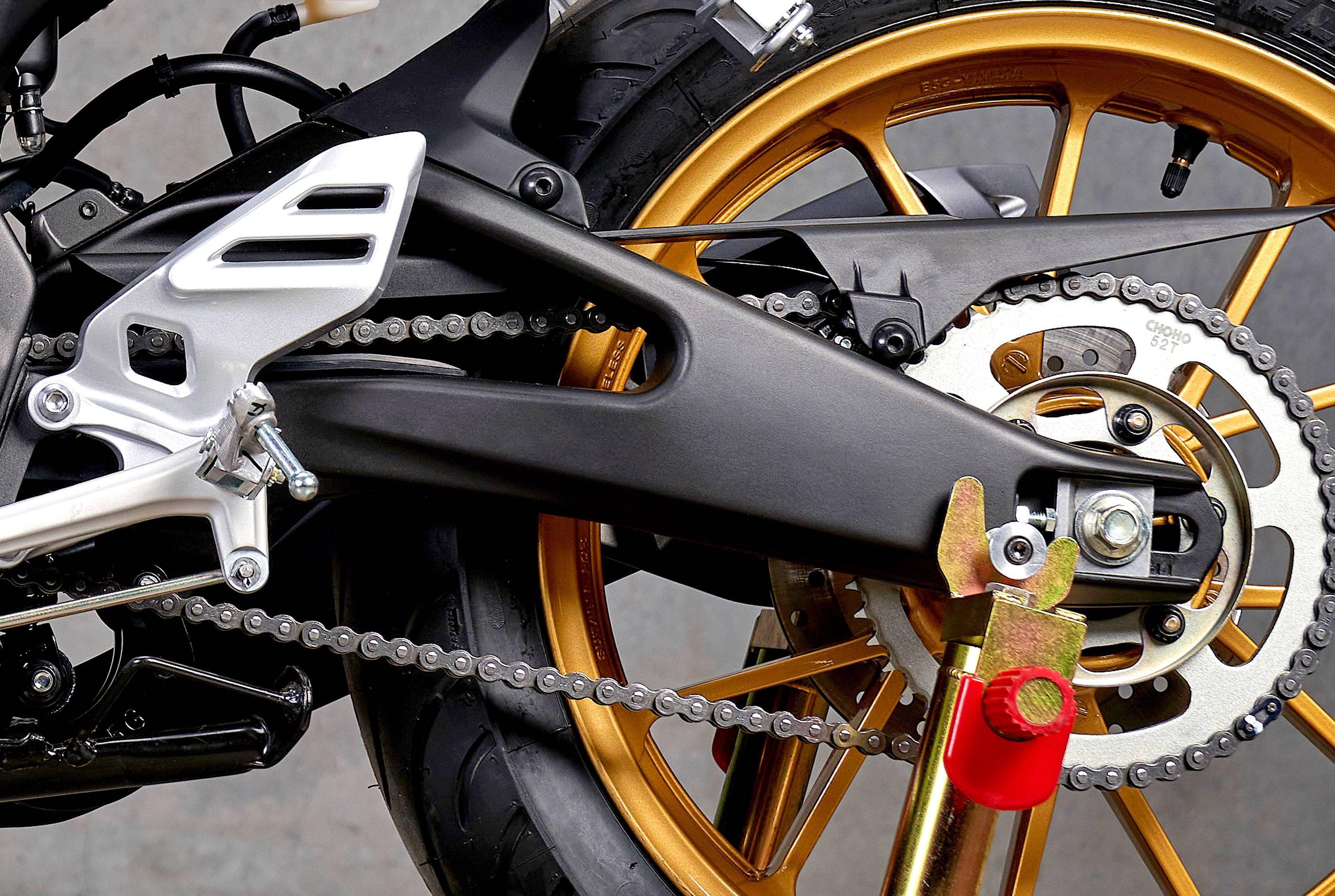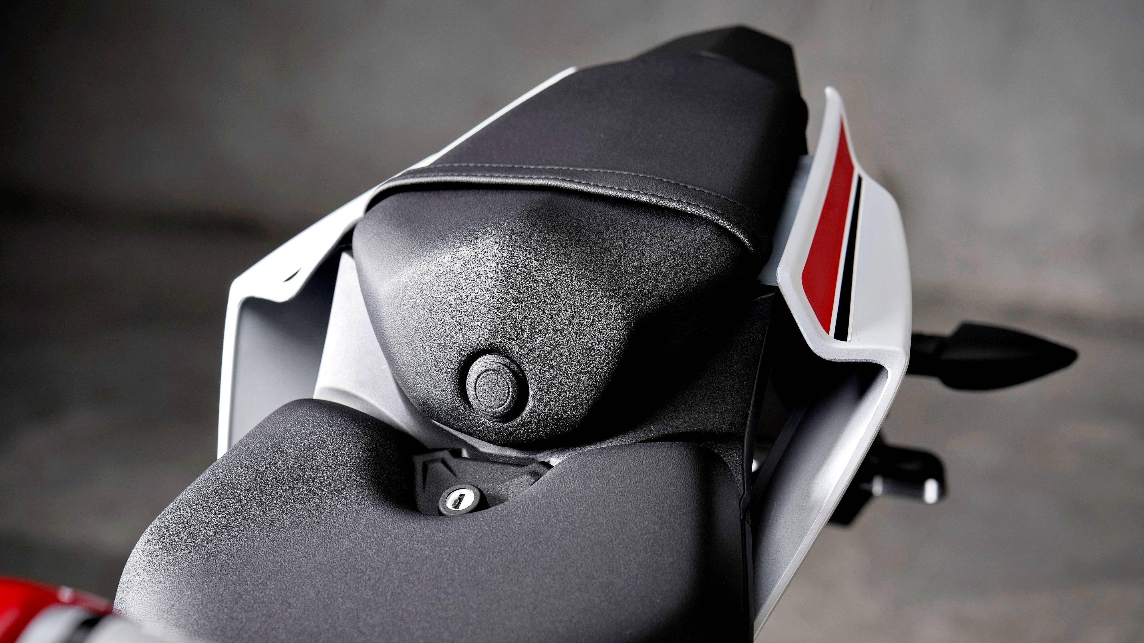 車體方面,采用一副鋼制的 Deltabox 空心闊面車架,左右不對(duì)稱式設(shè)計(jì)的后搖臂,叉芯口徑為 41 mm 的倒立式前叉,全數(shù)字式的儀表板,LED 的前大燈,全車整備重量為 142 公斤。