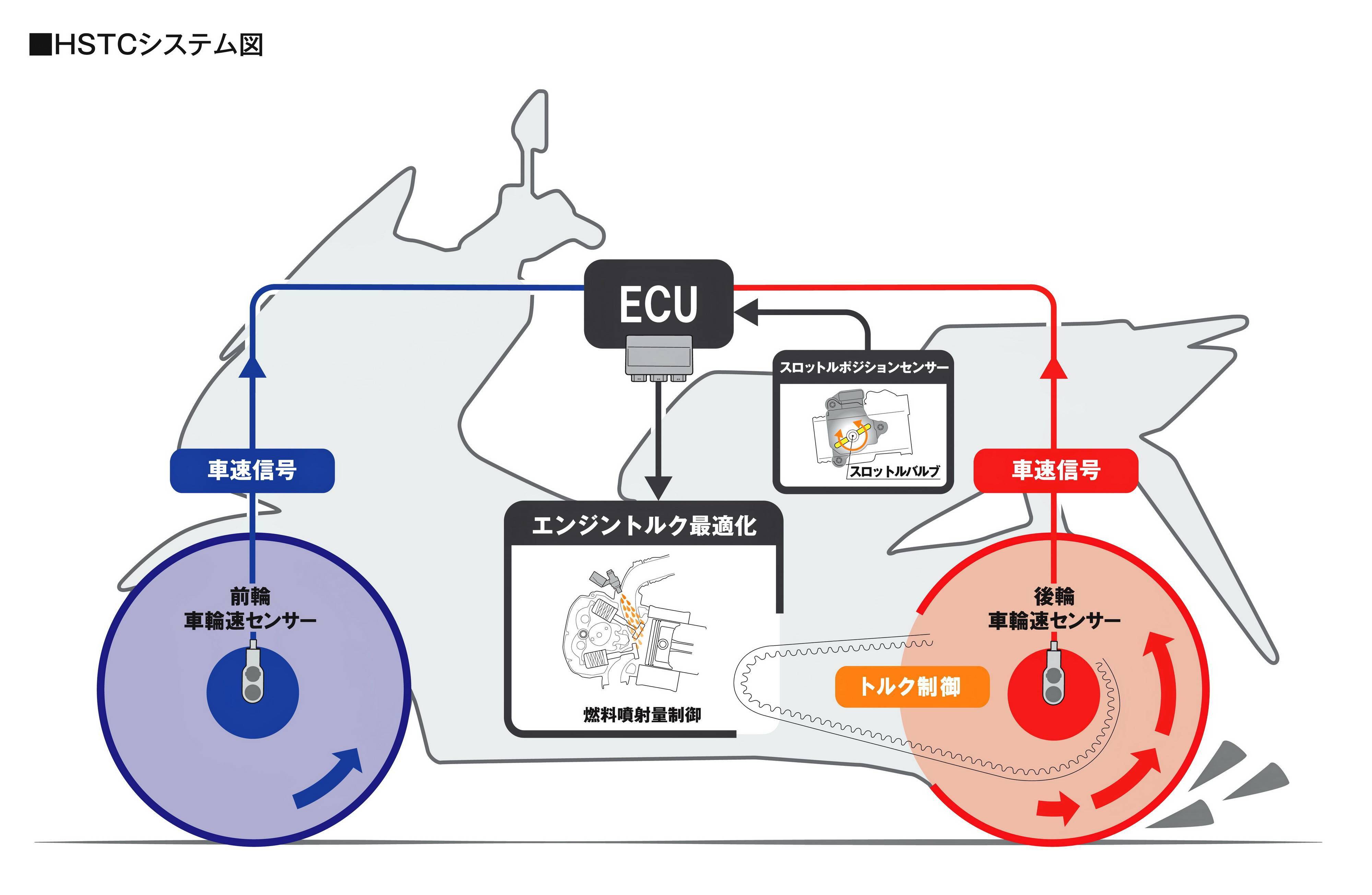 下面的圖片,新一代 PCX160 的 HSTC 牽引力控制系統(tǒng)(防后輪打滑)控制與工作原理 CG 示意圖(資料圖片)。