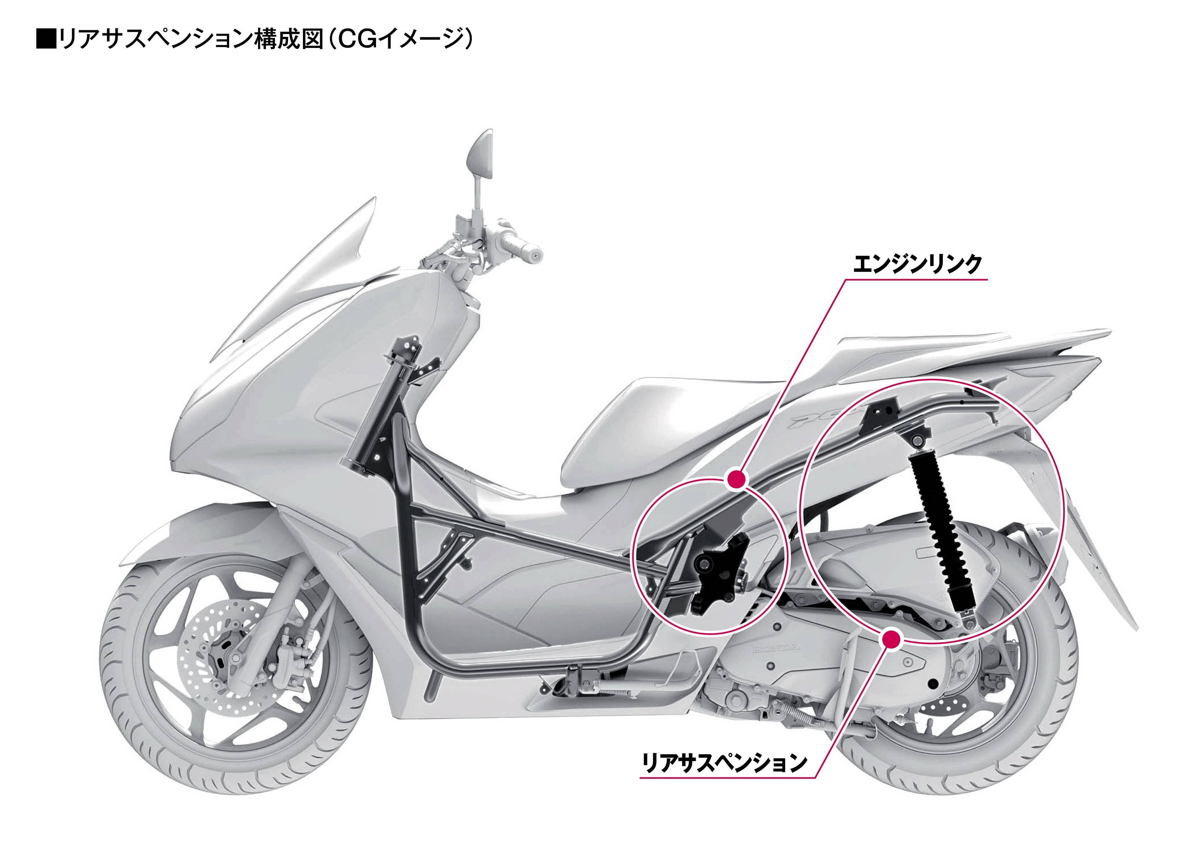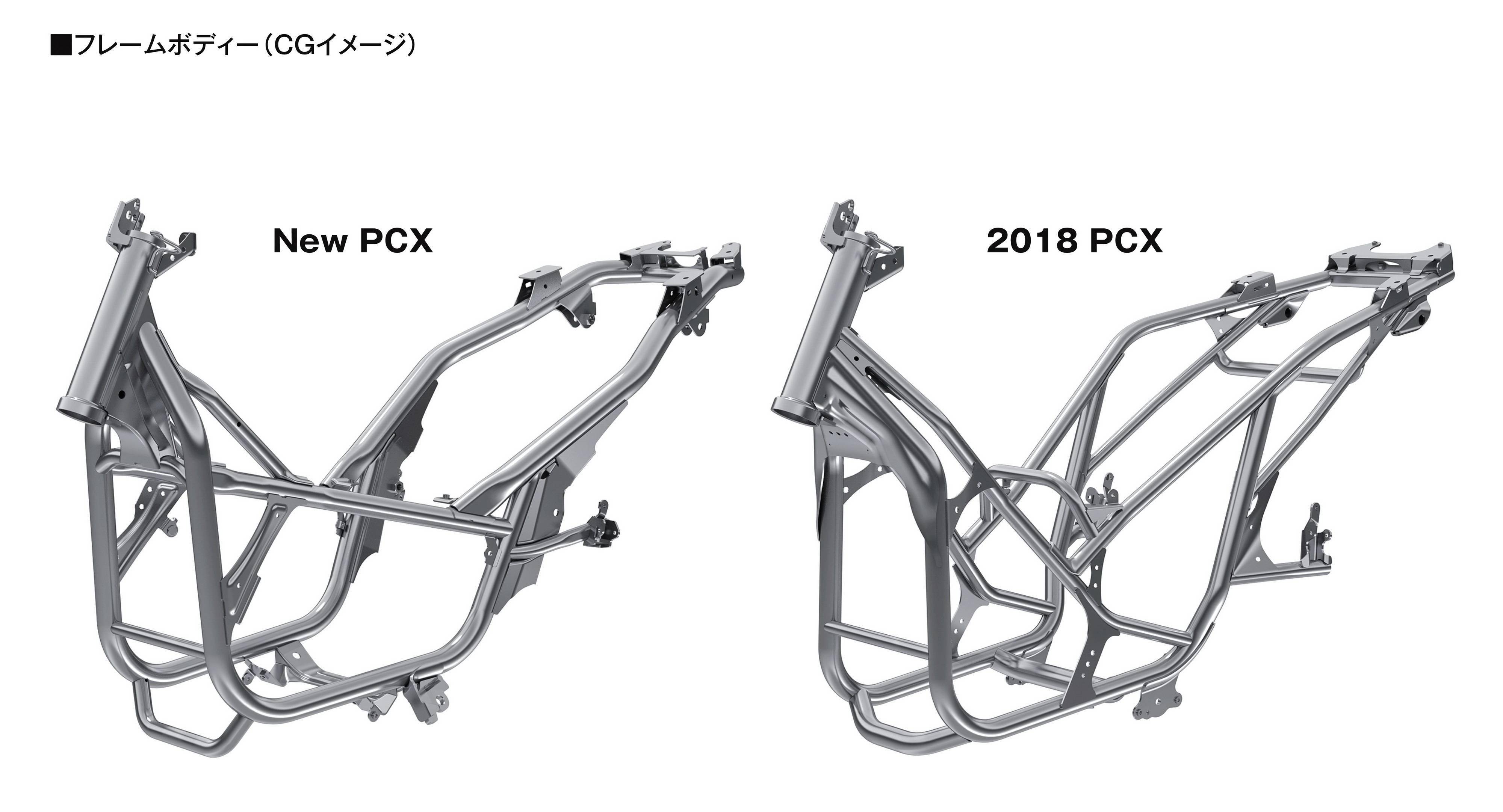 下面的圖片,新舊款 PCX 的車(chē)架主體結(jié)構(gòu)對(duì)比、以及后懸掛受力點(diǎn)結(jié)構(gòu) CG 示意圖(資料圖片)。