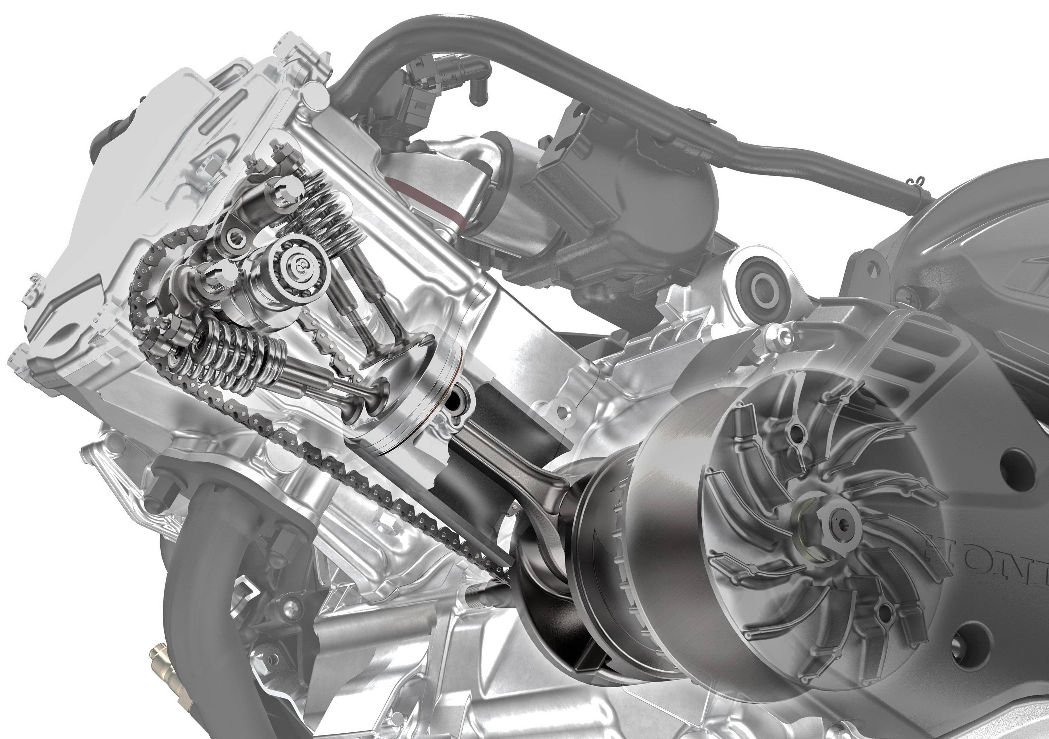 新車(chē)搭載一副全新的水冷單汽缸、SOHC 四汽閥的 eSP + 發(fā)動(dòng)機(jī),缸徑、行程為 60 mm %uD7 55.5 mm,排氣量 157 cc。而上一代的 PCX150,搭載兩氣閥的發(fā)動(dòng)機(jī),缸徑、行程為 57.3 mm %uD7 57.9 mm,排氣量 149 cc。帶耐磨涂層、并設(shè)計(jì)有潤(rùn)滑油噴油孔以改善潤(rùn)滑和冷卻的活塞,曲軸采用了更耐用的滾針軸承,內(nèi)部多處采用了降低磨擦的設(shè)計(jì)等等,都是這副 eSP + 發(fā)動(dòng)機(jī)的亮點(diǎn)。