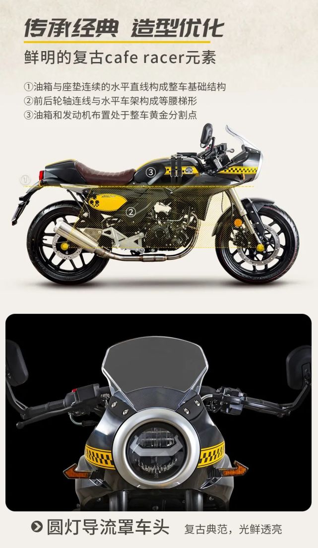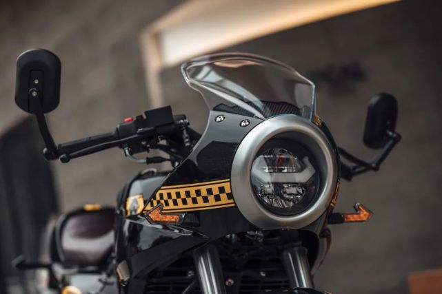 除了非常有味道的“豬頭罩”和圓燈單頭燈之外,油箱和坐墊在同一水平線上的設(shè)計自然不可或缺,包括外掛的后視鏡這些,都是非常經(jīng)典的cafe racer元素。