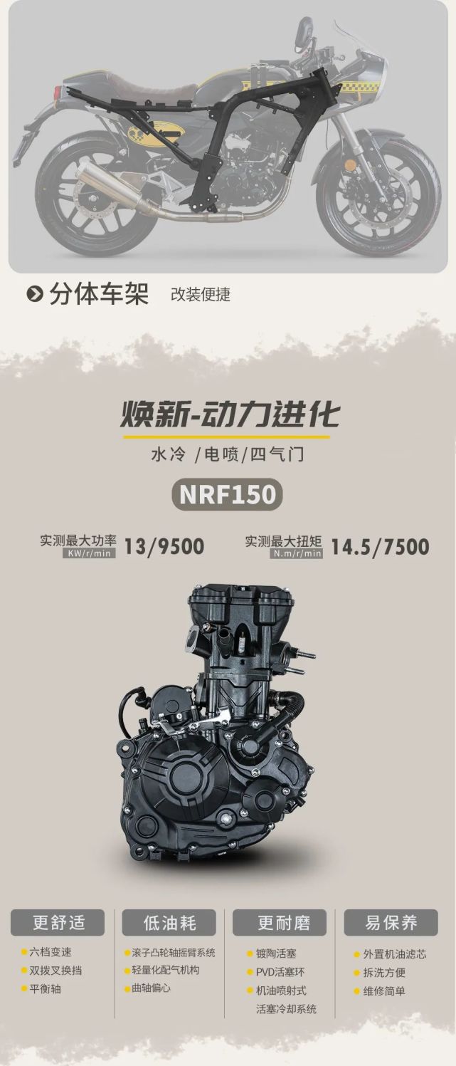 動力方面,該車搭載力帆自己研發(fā)的NRF150單缸水冷四氣門發(fā)動機(jī),最大功率13kw/9500rpm,最大扭矩14.5Nm/7500rpm,在國產(chǎn)同級別車型當(dāng)中屬于領(lǐng)先的水準(zhǔn)。