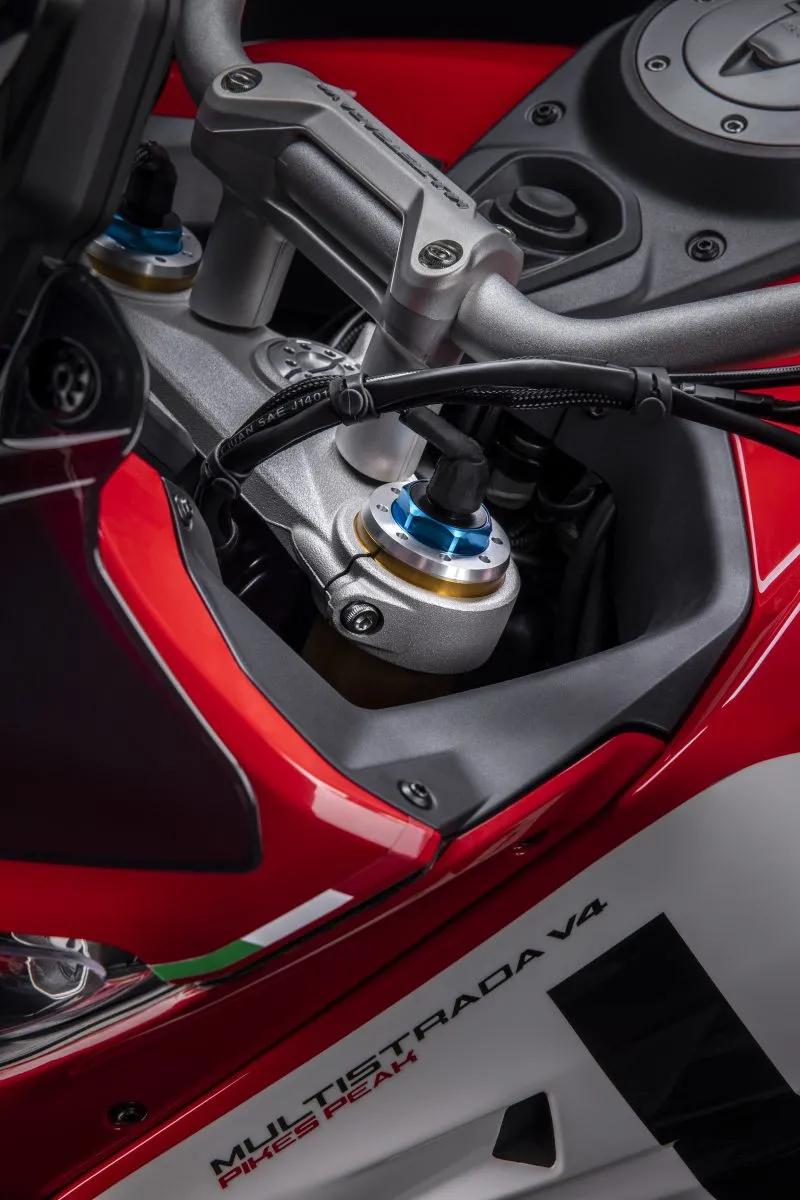 DUCATI表示Pikes Peak是將運(yùn)動(dòng)性能推向極限的Multistrada V4最強(qiáng)版本,因此毫不吝嗇地將前后OHLINS電子避震、MARCHESINI鍛造輪轂、特制鋁合金單搖臂、AKRAPOVIC天蝎排氣管等豪華配備通通列為標(biāo)配,并且也將騎姿調(diào)整得更加運(yùn)動(dòng)化、加入全新的“Race”騎乘模式,硬件配置直逼自家旗艦跑車(chē)Panigale V4s,誓言站穩(wěn)多功能車(chē)款的性能金字塔頂端!