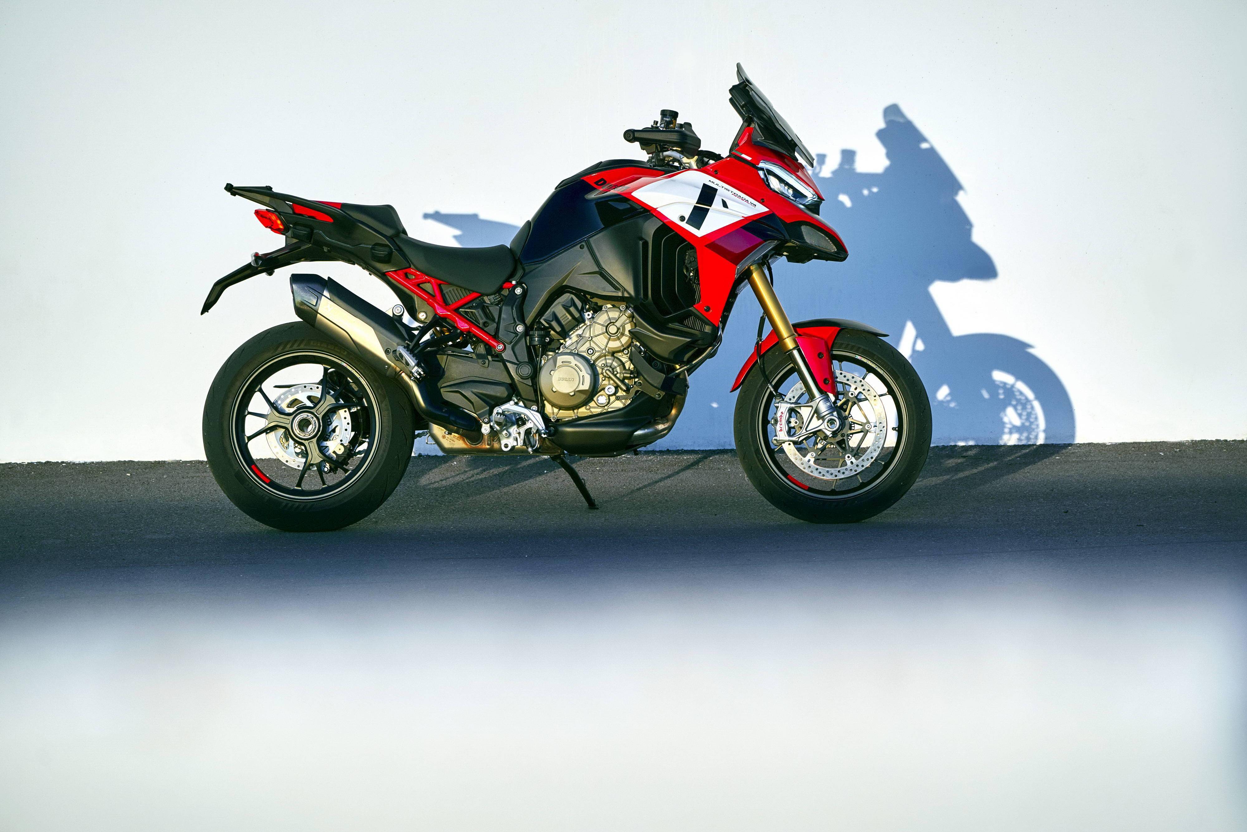 車(chē)體使用一副鋁合金制的承載式車(chē)架、后單搖臂,數(shù)字式的儀表板,前后 17 英寸的輪框,以及大量的電子控制裝備。去年的發(fā)布之初,Multistrada V4 有標(biāo)準(zhǔn)型、Multistrada V4 S、Multistrada V4 S Sport 三個(gè)版本,不同版本之間,配置狀態(tài)各有不同。