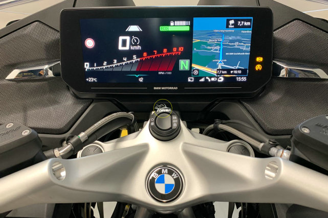 新款R1250RT配備了一塊10.25英寸的TFT儀表,屏幕的分辨率為1920×720像素,足以顯示導航地圖以及常規(guī)儀表盤,可以設置分屏顯示而無需輔助顯示器,這款儀表是目前量產(chǎn)摩托車當中最寬的液晶屏之一。