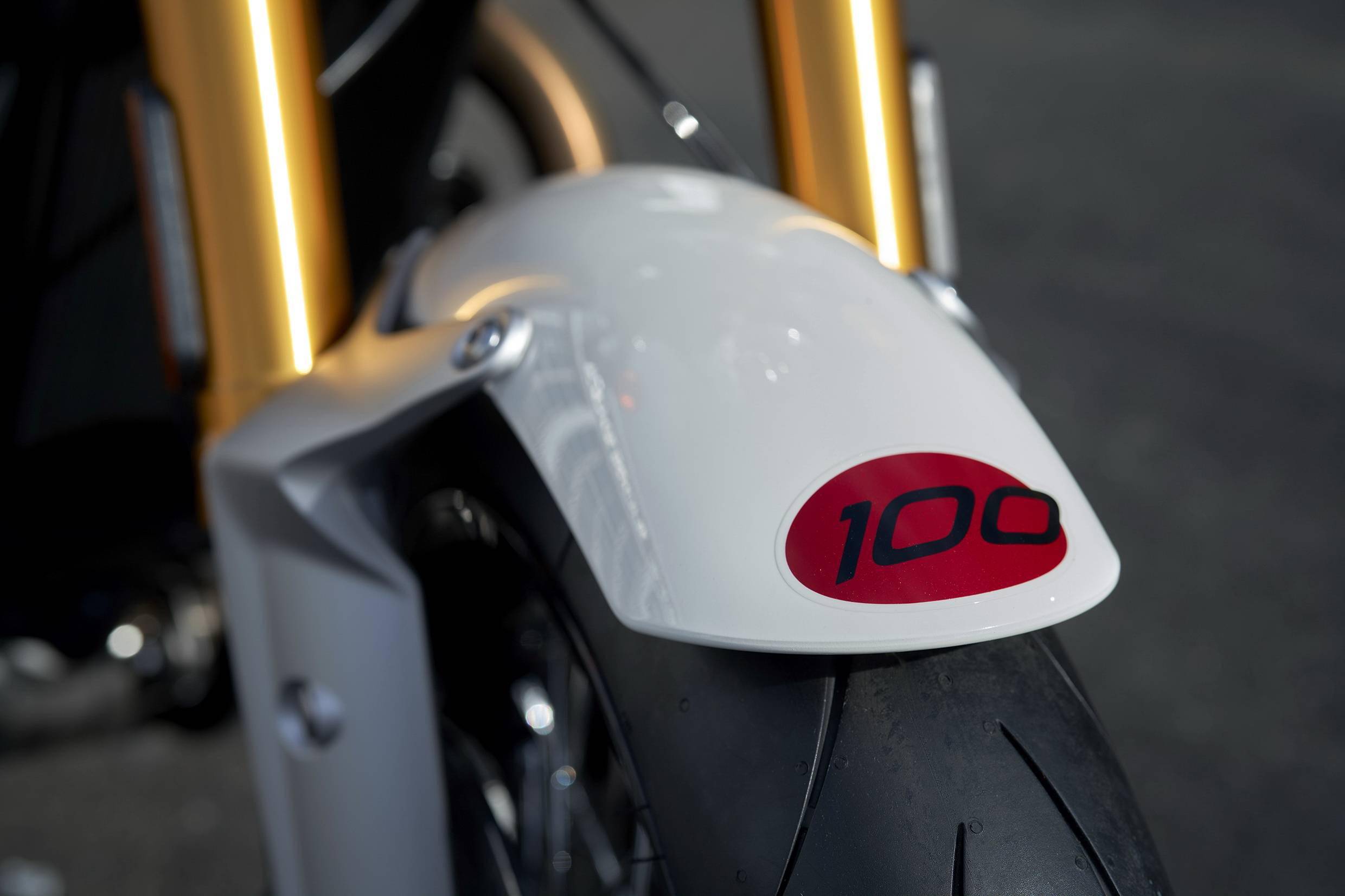 Thruxton RS TON UP 特別版,采用一個特別設(shè)計的車身圖案,鞍座后方的兩側(cè),有紀(jì)念突破 100 mph 的紅底黑字 “ 100 ” 字樣,部分組件的細(xì)節(jié)也經(jīng)過了定制化的處理。
