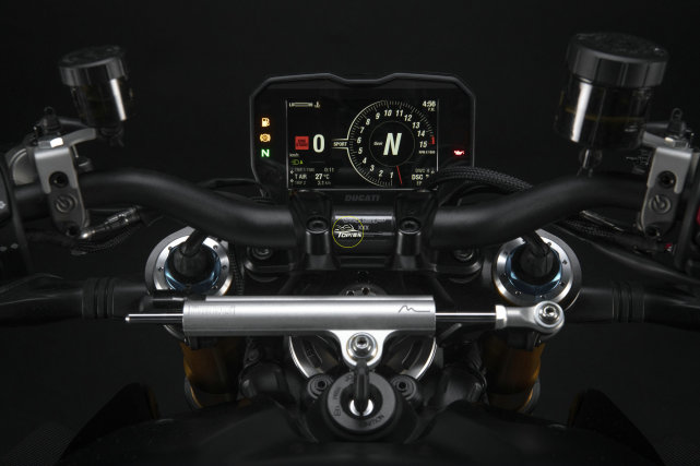 避震方面,采用Ohlins Smart EC 2.0半主懸架, Ohlins NIX-30倒立式前叉和Ohlins TTX36中置后避震,以及Ohlins鈦尺。
