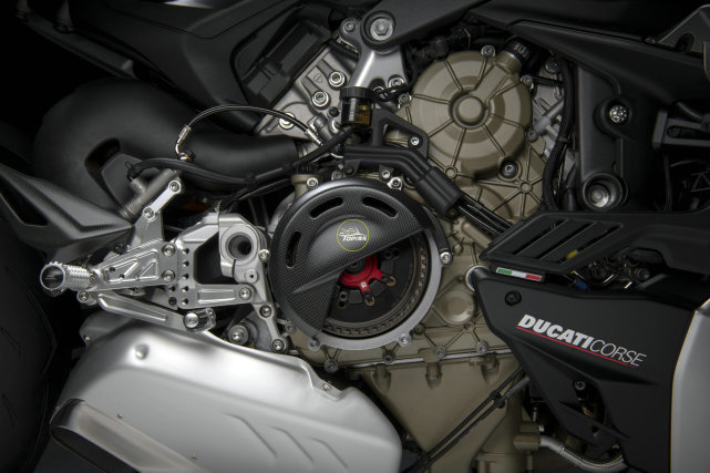動(dòng)力部分,依然是1,103cc排量的,Desmosedici Stradale 90度V型4缸發(fā)動(dòng)機(jī),最大馬力208Ps/13000rpm,最大扭矩123Nm/9500rpm。采用 STM EVO-SBK干式離合器,搭配由碳纖維材質(zhì)的開放式離合器蓋。