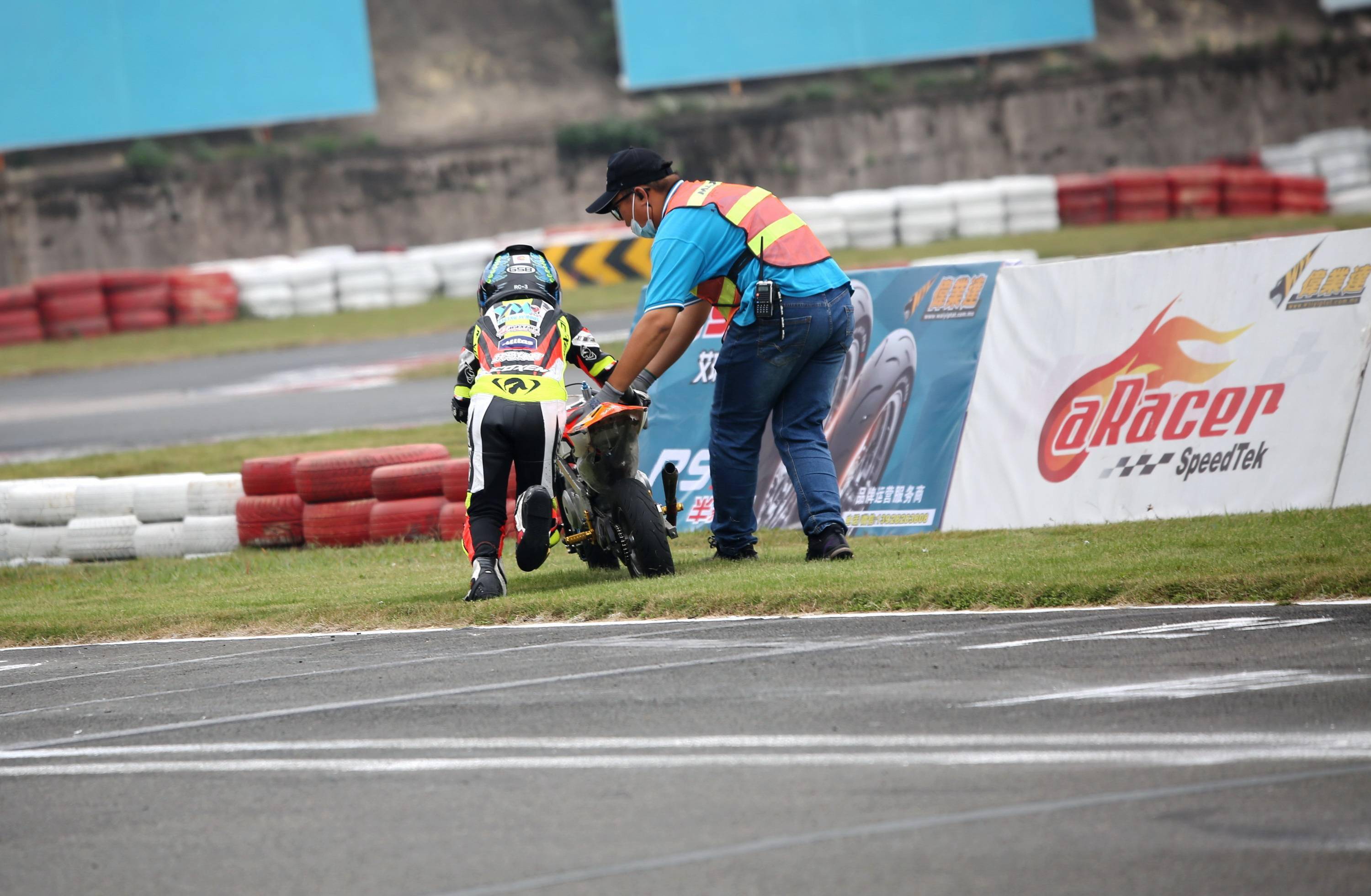 小童賽道體驗 B 組有十二位小車手參加。賽前的計時練習(排位賽)在水花飛濺的路面上進行,對于這些 “ 入門 ” 不久的小車手來說,無疑是一個巨大的挑戰(zhàn)。兩節(jié)的計時練習之后,95 號車的馬靖堯綜合圈速最快、奪得了排頭位出賽。