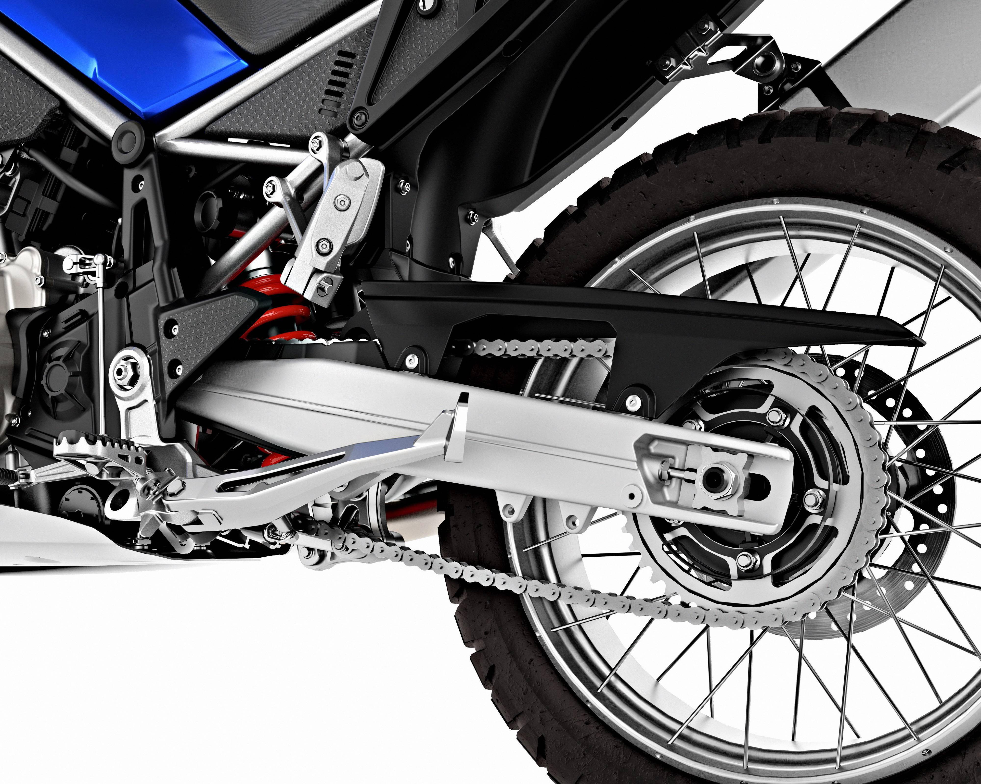 車體方面,采用了全新設(shè)計的鋼管式車架(RS 660 和 Tuono 采用合金雙翼樑式的闊面車架),考慮到越野環(huán)境下使用所需要的可靠性和堅固性,Tuareg 660 的車架與發(fā)動機之間有六個固定錨點(RS660 只有三個、而 Tono 660 只有兩個)。使用更長的鋁合金制后搖臂,長行程(前、后均為 240 mm)的倒立式前叉、多連桿聯(lián)接的單筒式后減震,前 21、后 18 英寸直徑的鋼線式輪框。