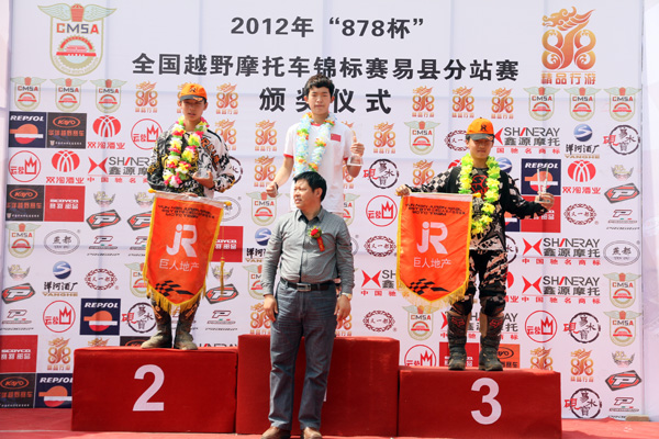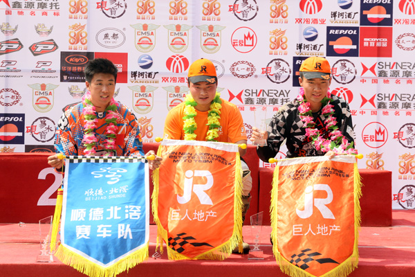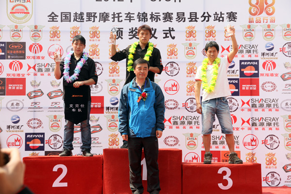 在上午首先進行的是國產(chǎn)110CC組比賽,內(nèi)蒙古烏拉特后旗賽車隊的烏日嘎一發(fā)車就搶到第一,并且把優(yōu)勢一直保持到了最后,保定濠杰隊的王克和徐帥緊隨其后最終獲得第二、三名。冠軍的有力爭奪者云南巨人地產(chǎn)摩托車隊的保濤比賽中賽車出現(xiàn)問題,多次停留在賽道上,耽誤了不少時間,最終僅獲第四。經(jīng)過兩場比賽后,烏日嘎獲得易縣站冠軍,王克和保濤分獲第二、三名。保定濠杰隊也憑借幾名車手的出色發(fā)揮,獲得團體賽第一,內(nèi)蒙古烏拉特后旗隊及桂林發(fā)現(xiàn)者越野俱樂部獲得團體賽的第二、三名。