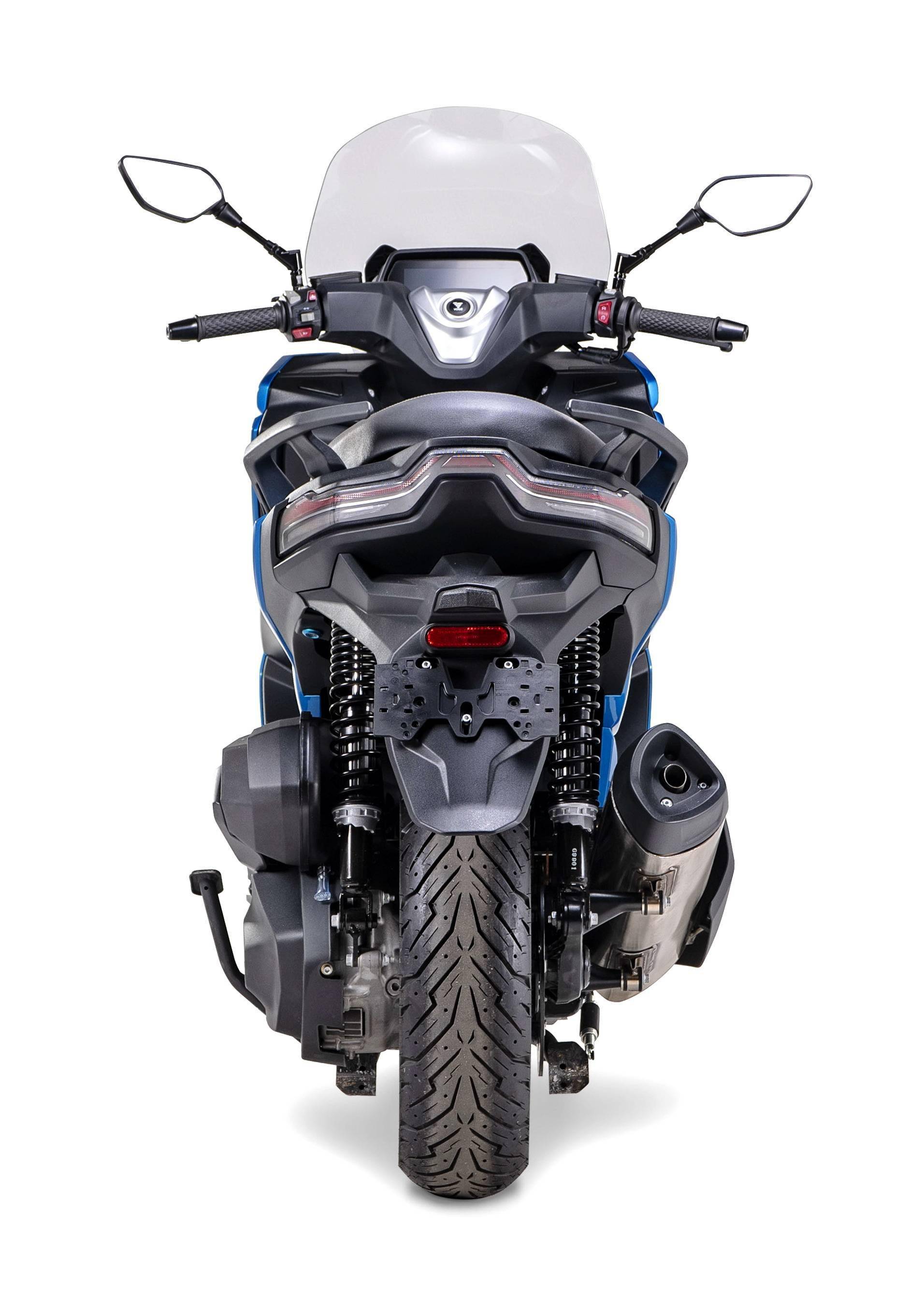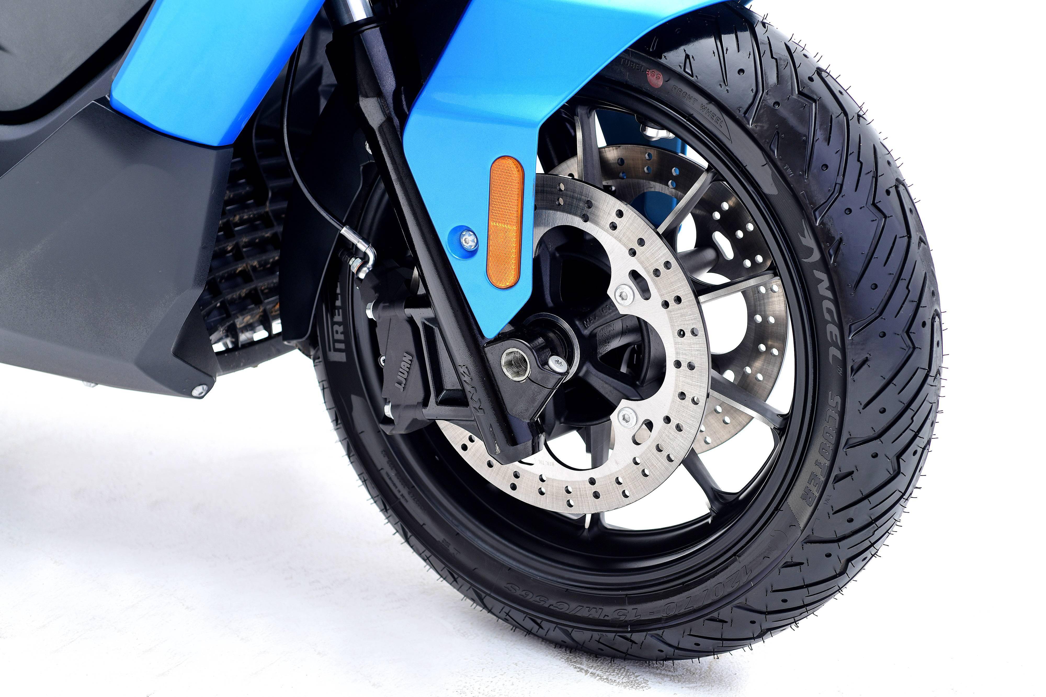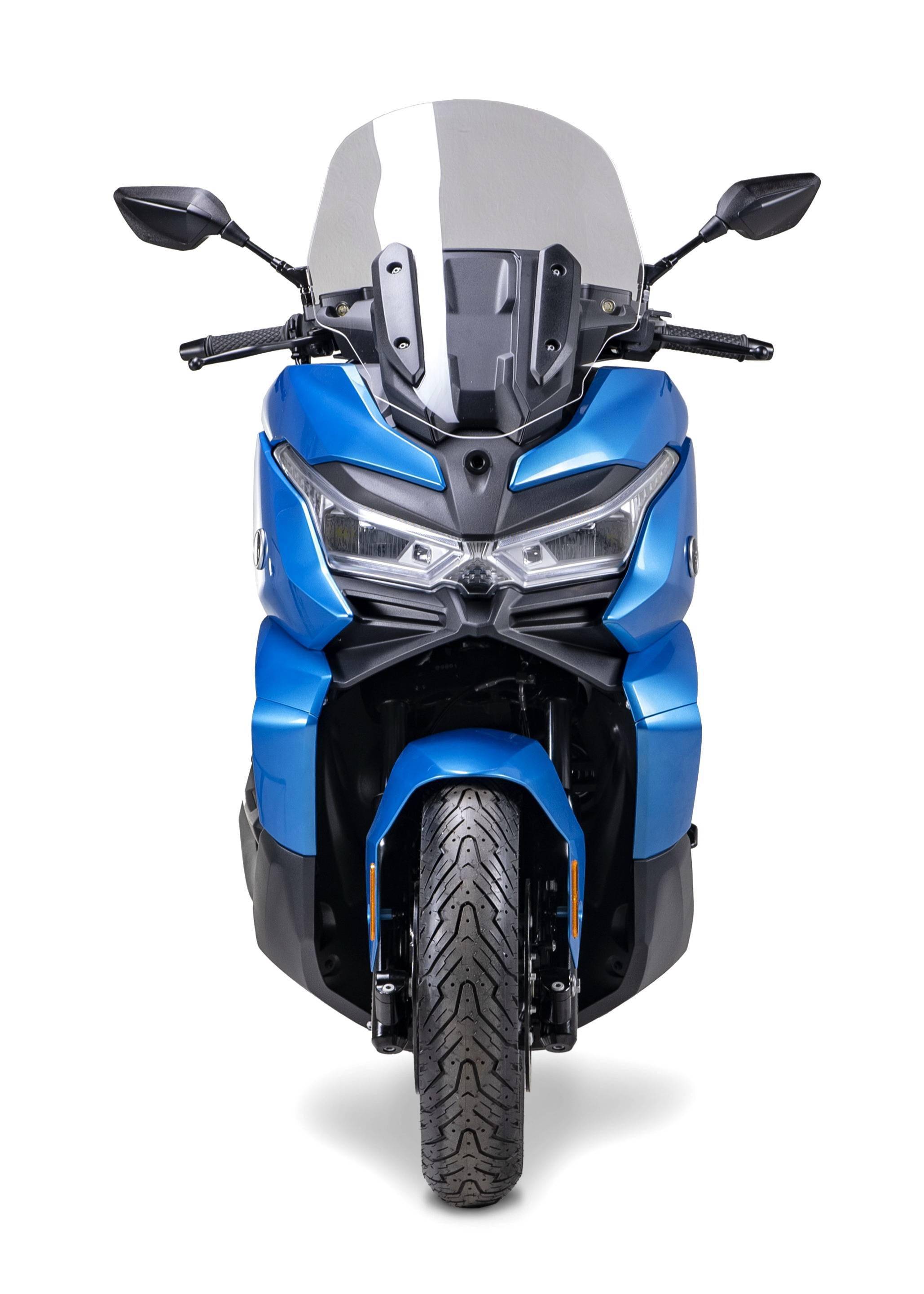 車體采用一副方形截面的鋼管式車架,KYB 配套的懸掛系統(tǒng),LED 的前大燈,前風擋的防護罩下、內置了攝像頭,數字式的儀表板,與 BMW C400X 同規(guī)格的前 15(120/70 - 15)、后 14(150/70 - 14)英寸直徑的輪框。