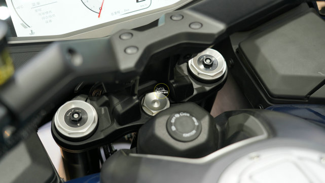因為配置很豐富,所以手把上的按鍵也比較多,除了常規(guī)按鍵還包括電動風擋調(diào)節(jié)、儀表功能設置。另有,MAGURA液壓離合,Brembo直推上泵,可調(diào)節(jié)的左右牛角,以及加熱手把。