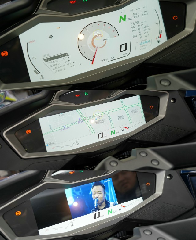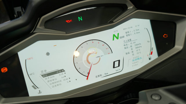 這臺車配備了,目前國產(chǎn)摩托車上尺寸最大的12.3英寸TFT全彩儀表,分辨率非常地高,具備180度的可視范圍。而且功能非常豐富,什么藍牙連接,胎壓監(jiān)測,手機投屏,導航等等。