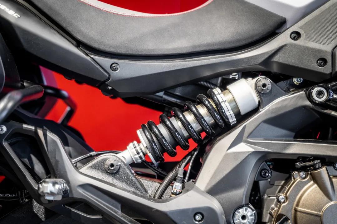 偏心側(cè)置的液壓彈簧式后避震,彈簧硬度和回彈阻尼系數(shù)均可調(diào)整。