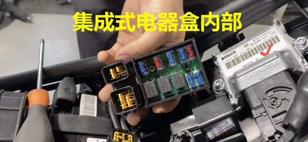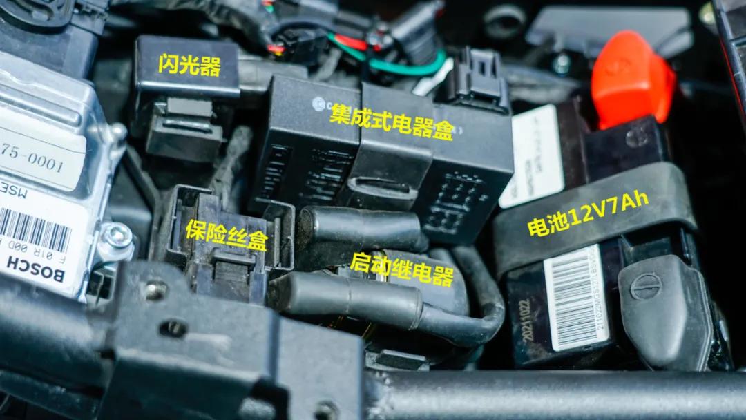 電瓶為猛獅品牌膠體電池,容量7Ah;電瓶旁邊安置了車輛的保險(xiǎn)絲盒、閃光器、啟動(dòng)繼電器以及無極車輛特有的集成式電路盒。值得注意的是,集成式電路盒內(nèi)部也存在有大量保險(xiǎn)絲。