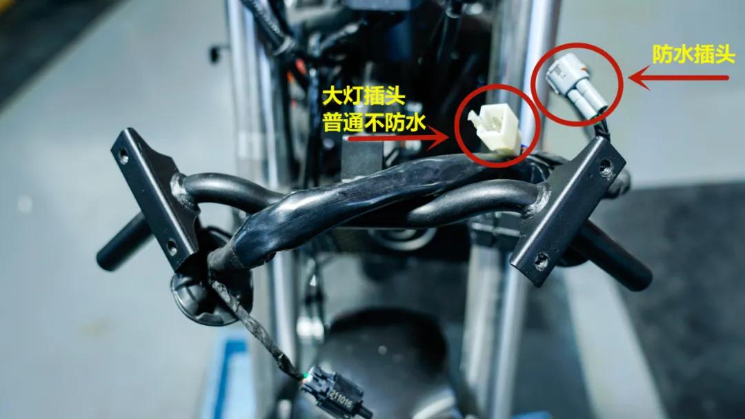 內(nèi)部線路做工及走線部分依舊是該級別車型常規(guī)水準(zhǔn),部分插頭連接件設(shè)計(jì)有專用固定位,大部分則為扎帶捆扎。車身大部分插頭也都采用了標(biāo)準(zhǔn)的防水插頭,但是大燈電源插頭以及后部尾燈插頭并未采用防水插頭而是普通插頭。
